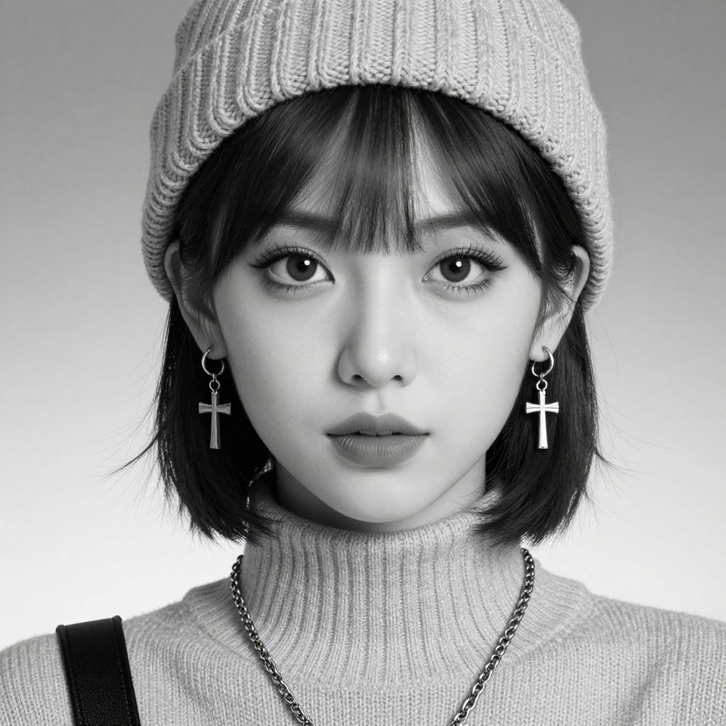 Black and white close-up portrait of a stylish young woman with a short bob haircut wearing a knitted beanie and a high-neck textured sweater. She has large expressive eyes, well-defined eyelashes, and is accessorized with cross earrings and a chain necklace. The image emphasizes detailed facial features and fashion elements with a soft gradient background.