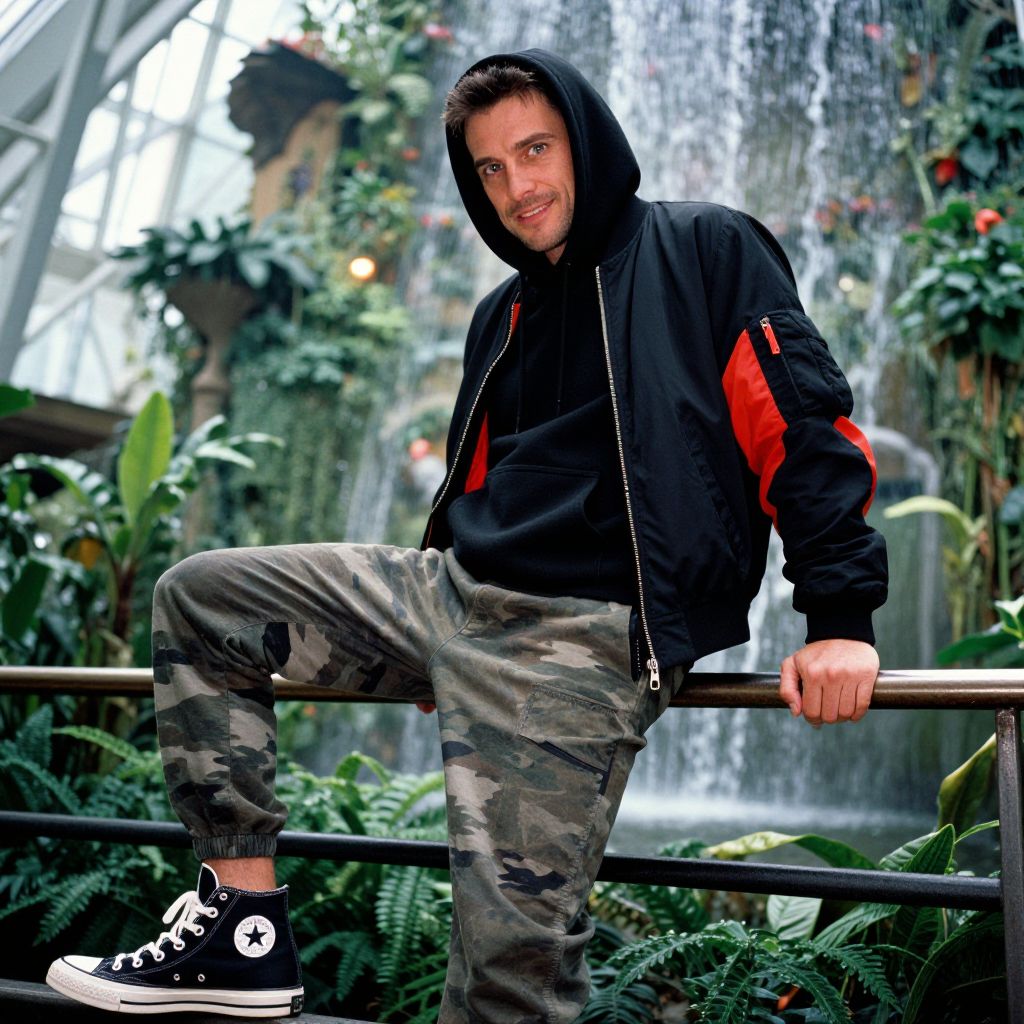 A man, fitted black hoodie, camo print joggers, high-top canvas sneakers, bomber jacket, bold color accents, bright atrium, cascading indoor waterfall, vibrant greenery, ektachrome film stock, relaxed pose, leaning against a railing, confident smile.Man has masculine face and piercing eyes
