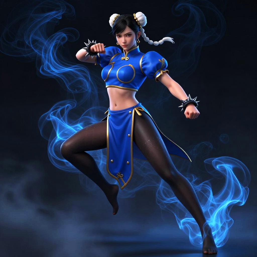 Masterpiece, best quality, ultra-detailed, Epic CG masterpiece, hdr, dtm, full ha, 8K, ultra detailed graphic tension, dynamic poses, stunning colors, 3D rendering, surrealism, cinematic lighting effects, realism, 00 renderer, super realistic, full - body photos, super vista, super wide Angle, HD(Blue smoke enveloped the body:1.3)Long blue cheongsam(Black background:1.5)1girl, solo, chun-li, dynamic posture, spike bracelet, fighting stance, (full body:1.5), (long legs:1.4), (Black transparent pantyhose:1.3)(Milky skin:1.6) (shiny skin:1.4)A shot with tension(sky glows blue, Visual impact, giving the poster a dynamic and visually striking appearance:1.2), Chinese Zen style, impactful picture