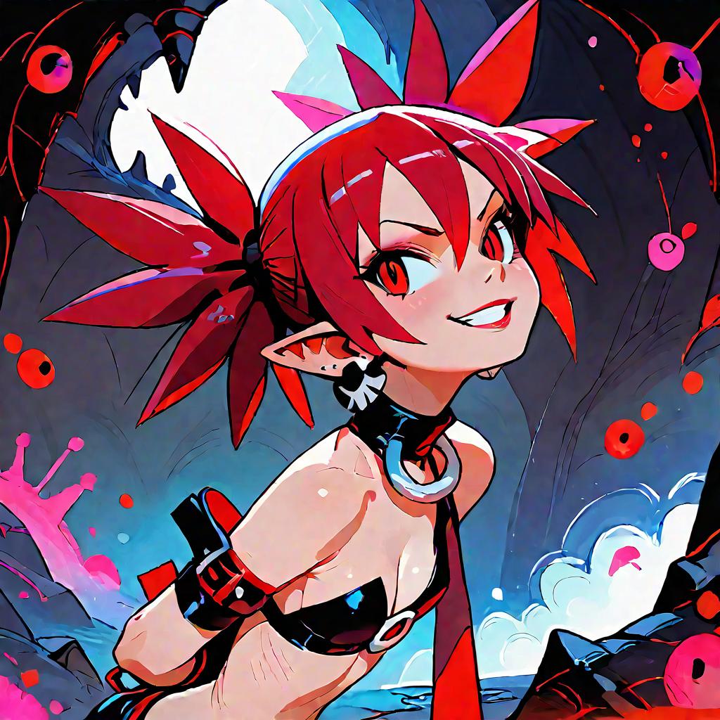 Score_9, source_anime, 1girl, etna \(disgaea\), red eyes, standing, leaning forward, evil smile, upper body, black bikini, arms behind back, cave, arched back