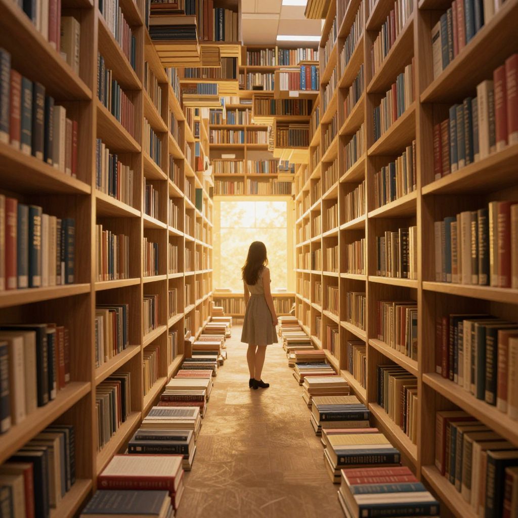 In a surreal, computer-generated library corridor bathed in golden-hour lighting, a woman stands amidst shelves of ever-changing books, their covers forming a vibrant pathway that seems to loop endlessly, evoking a dreamlike, high-definition fantasy reminiscent of a living, breathing narrative.