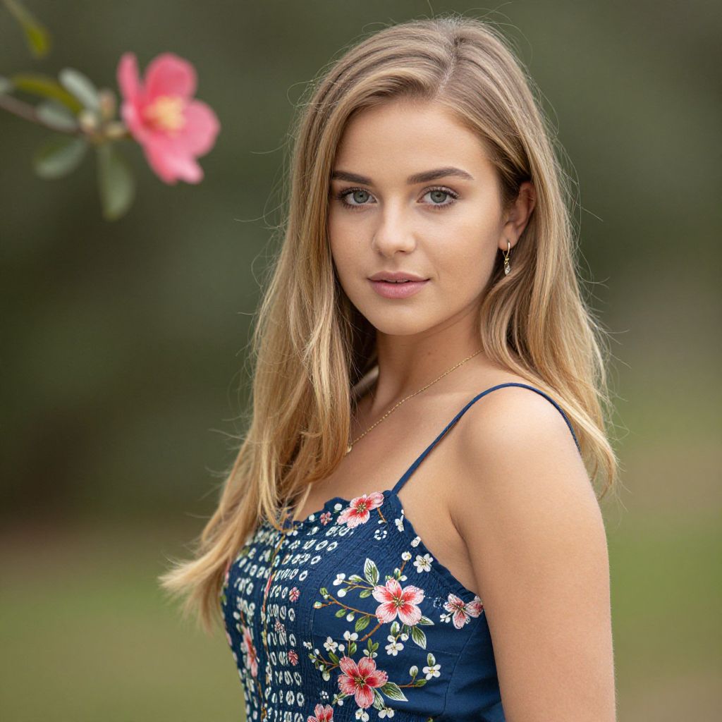 Photograph of a young Caucasian woman with light skin and long, blonde hair, wearing a navy blue, spaghetti-strap dress adorned with white and red floral patterns. She has green eyes, subtle makeup, and small gold earrings. Her expression is neutral, with a slight, closed-mouth smile. A blurred pink flower is visible in the upper left background, set against a softly focused green and brown outdoor setting. The lighting is natural, highlighting her smooth skin and delicate features. The overall composition is vibrant and serene.