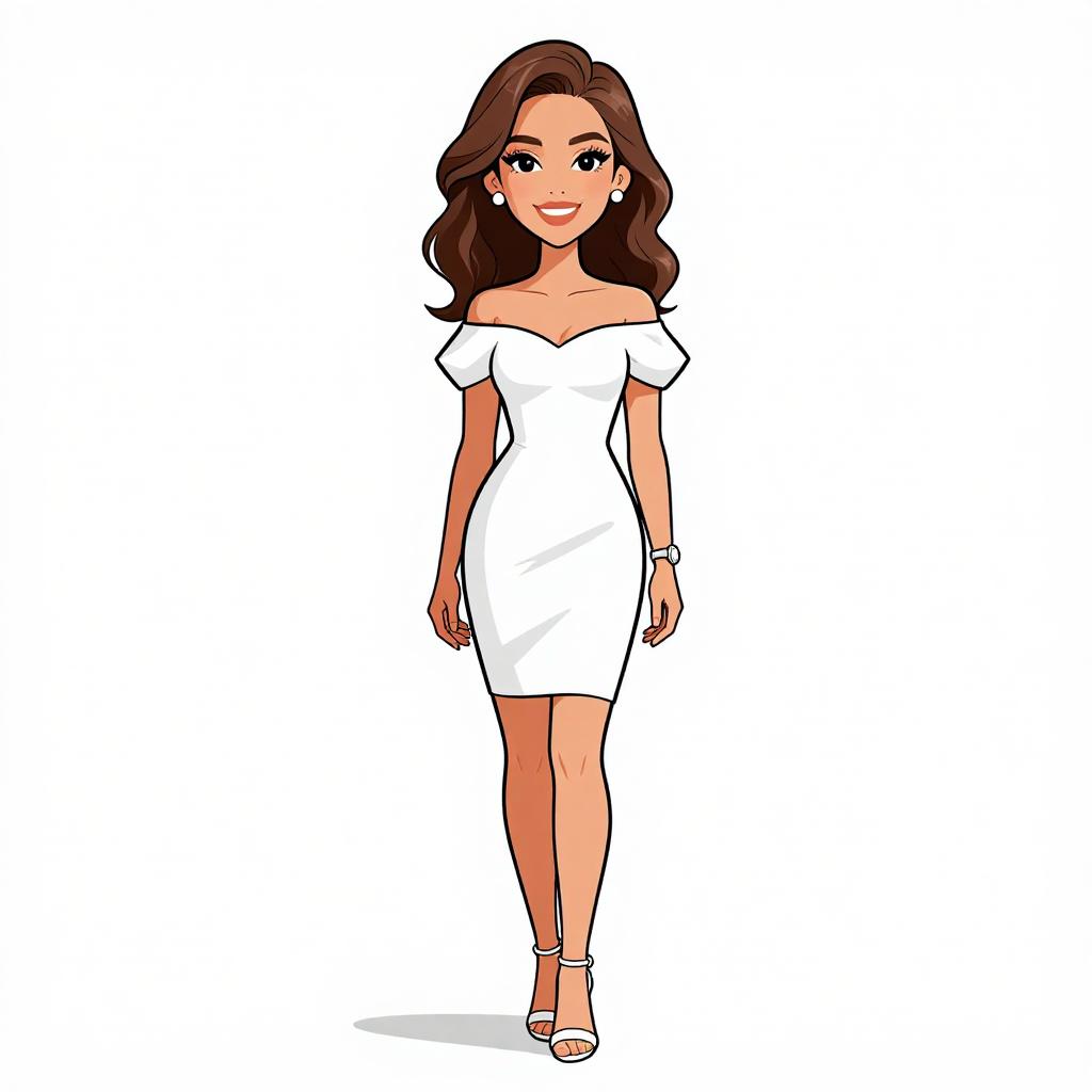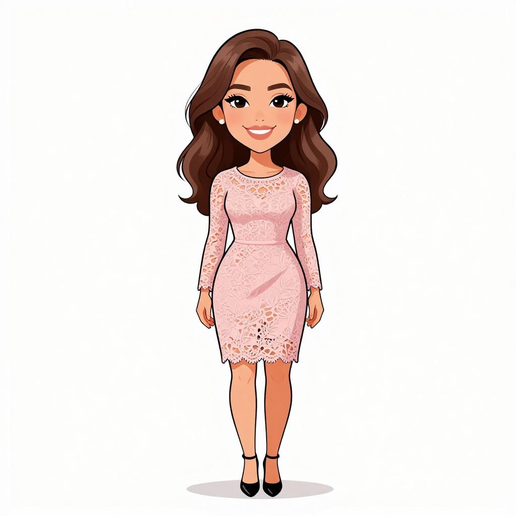 Woman with pretty face and pretty hair. smiling Woman, romantic style, lace shift dress in pastel pink, long sleeves, simple round neck, scalloped hemline, knee-length, cut-out detailing, paired with black strappy heels, plain white studio background. --sref 1467