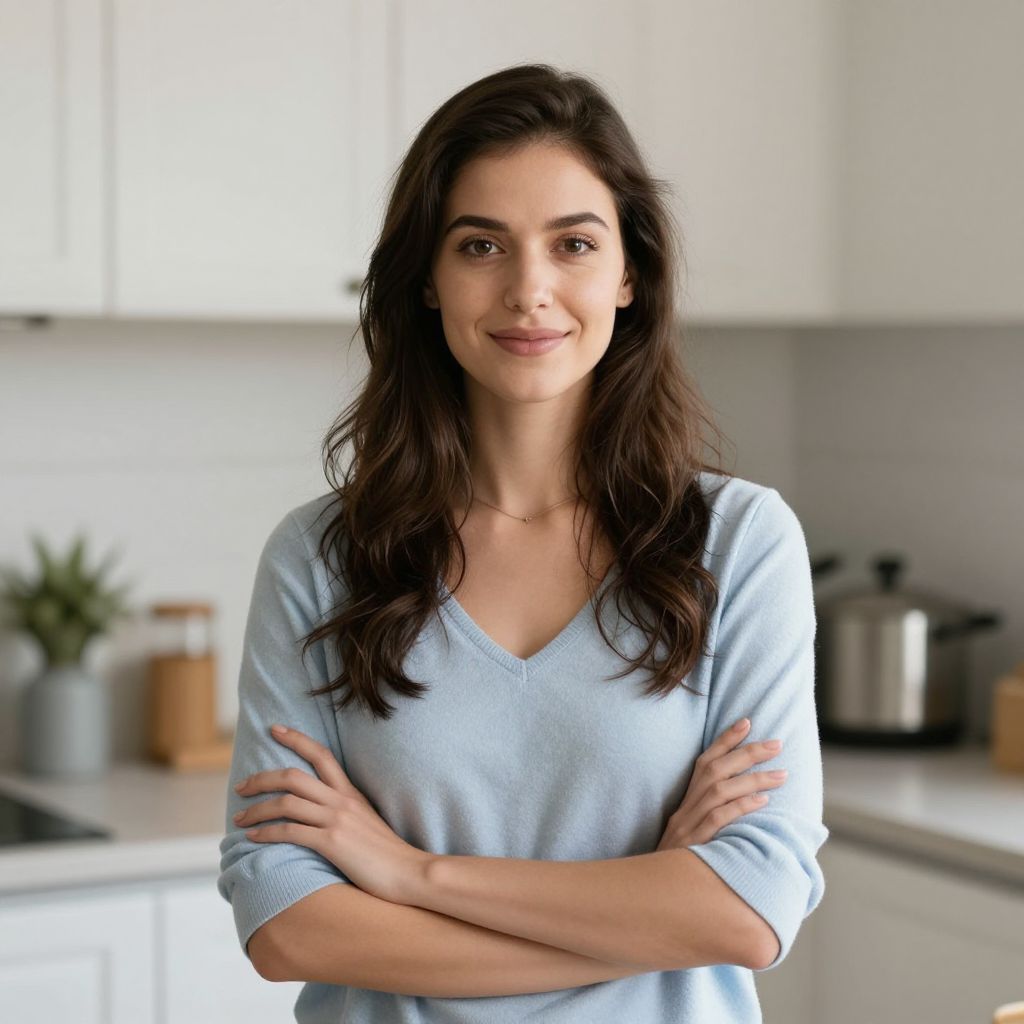 Photograph of a smiling young woman with long dark hair, wearing a light gray V-neck t-shirt, standing in a bright kitchen with white cabinets,