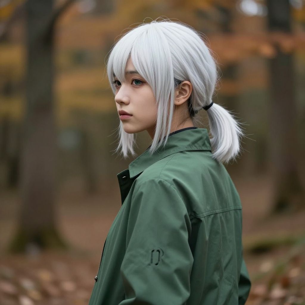 Photograph of a young woman with white hair in a ponytail, wearing an olive green jacket, standing in a blurred autumn forest.