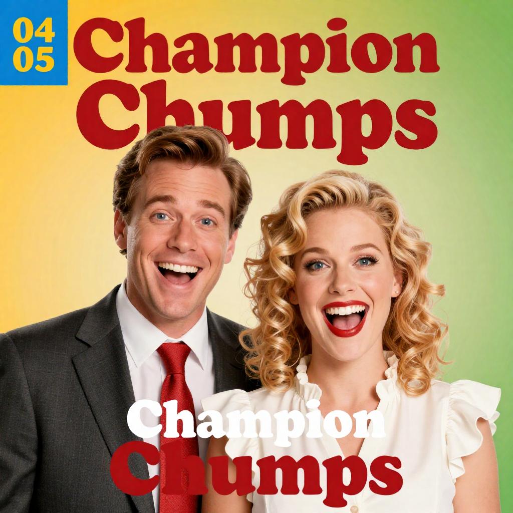Photograph of a movie poster. Two smiling people, man on left in suit with red tie, woman on right with curly blonde hair, white ruffled blouse. "Champion Chumps" in bold red above. Background gradient from yellow to green. Both have open mouths, showing teeth. Text in blue and yellow upper left corner. Movie title in white and red lower center.