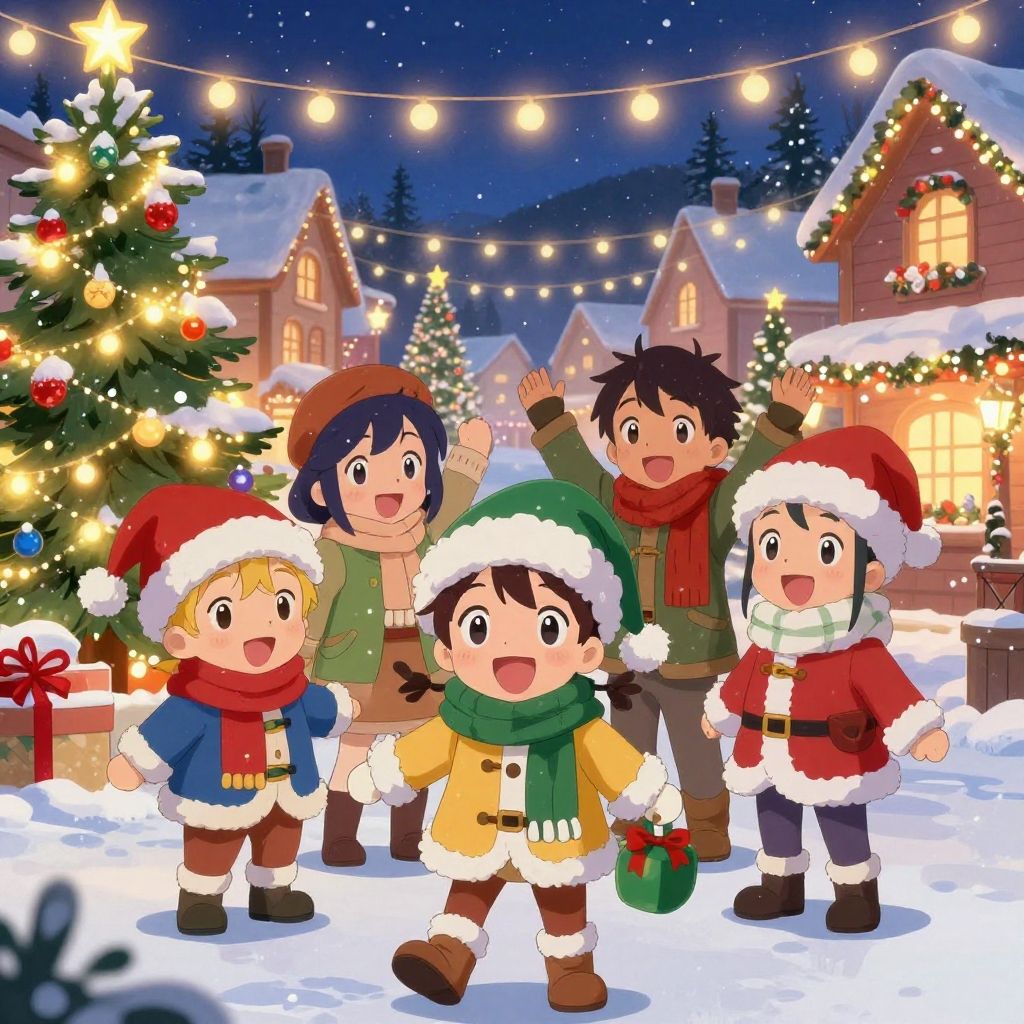 Navidad anime scene with vibrant holiday decorations, cheerful characters wearing festive outfits, glowing lights, and snowy town background, in a colorful and cozy style.