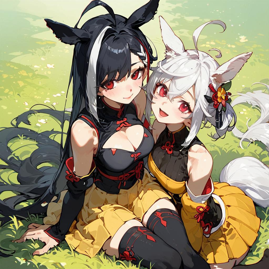 [score_9, score_8_up, score_7_up], source_anime, 2girls, sitting, side-by-side, classroom, kitasan black \(umamusume\), (summer uniform), sitting on desk, looking at viewer, smile, blush2girls, satono diamond \(umamusume\), blush