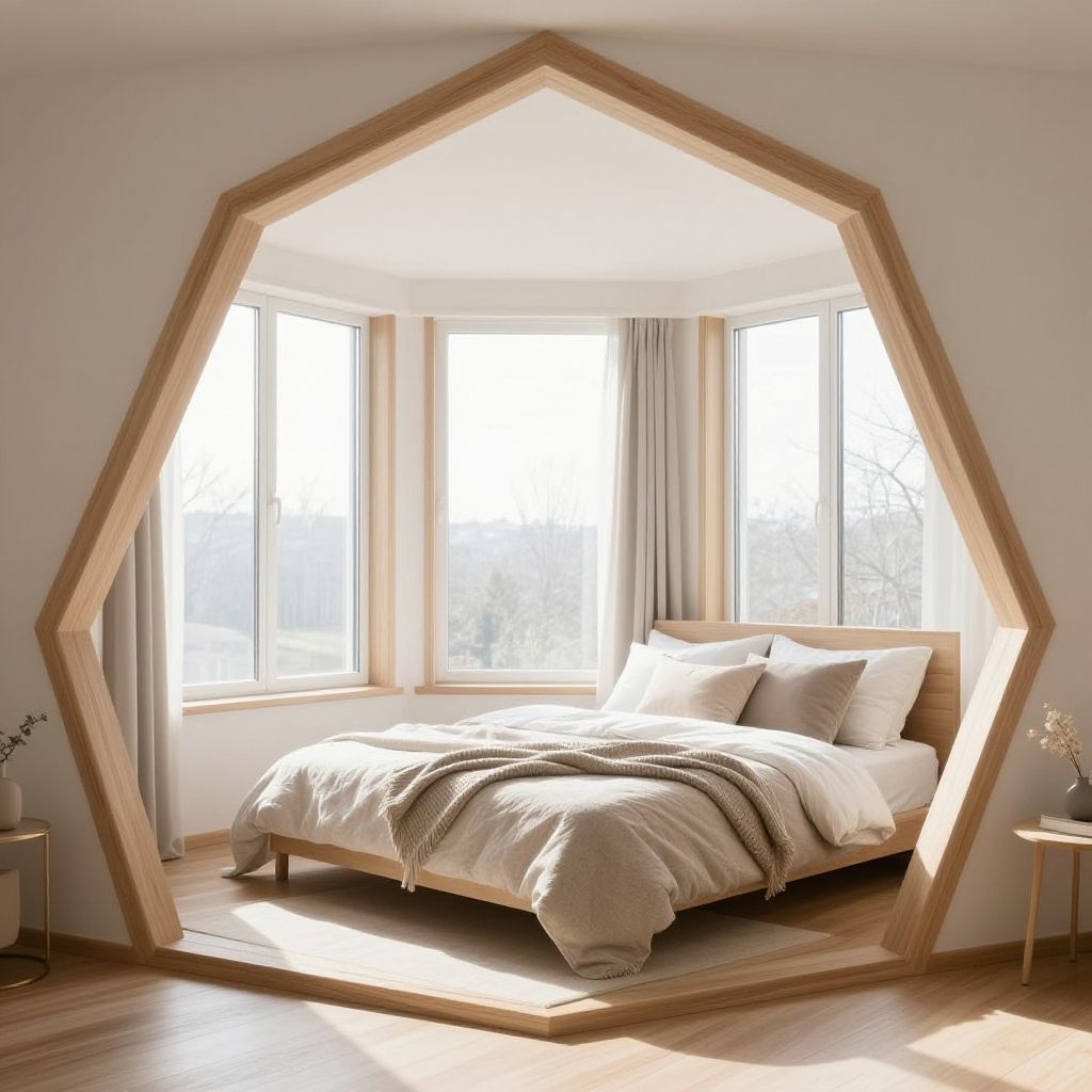 Pentagon shaped bedroom designed in Scandinavian style, light wood accents, cozy textiles, neutral pastel color palette, with plenty of natural sunlight pouring through tall windows.