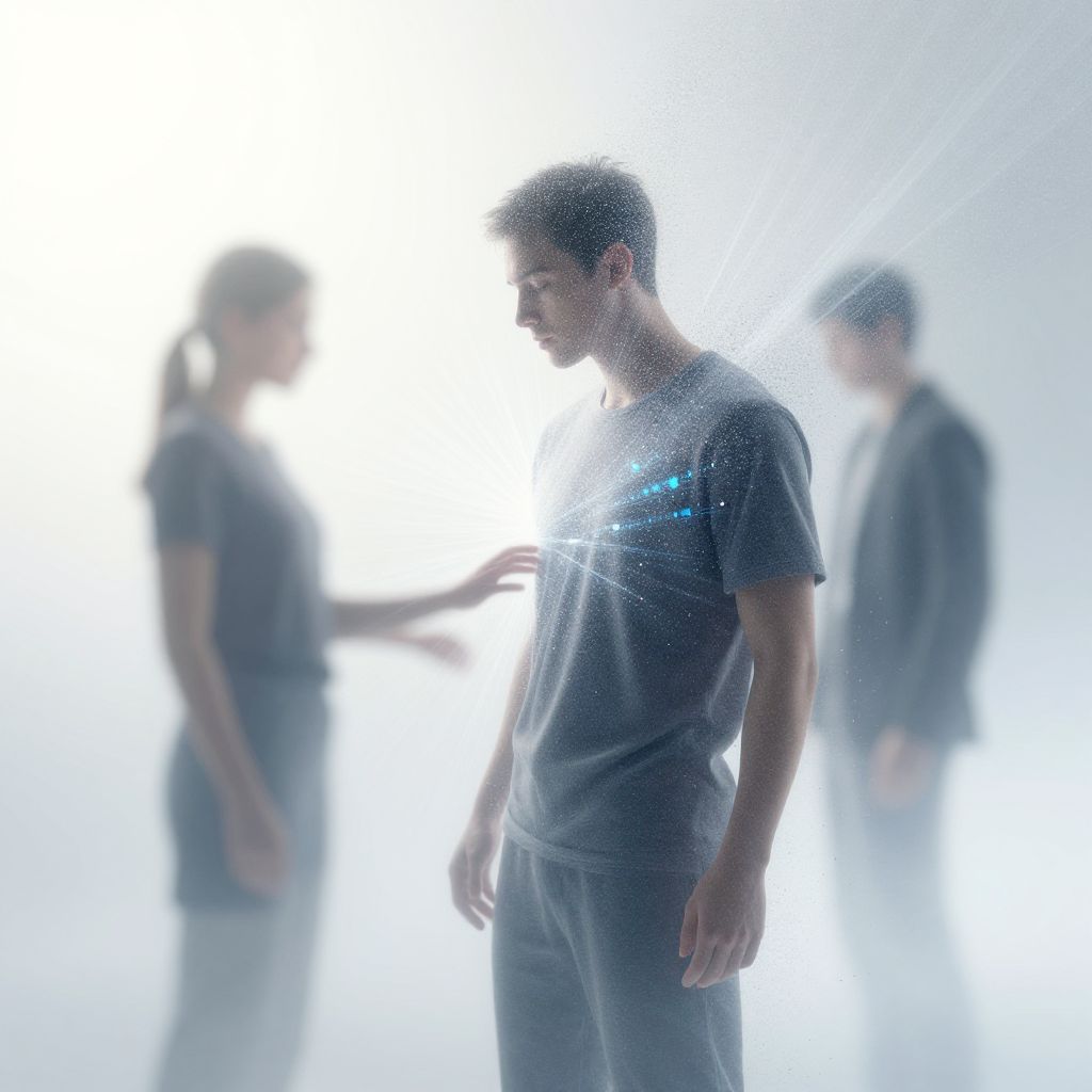 Remove clothes ai art illustrating the ethical boundaries of AI technology, subtle human forms dissolving into digital particles, surreal style with soft light rays and translucent textures, focus on technology-human interaction