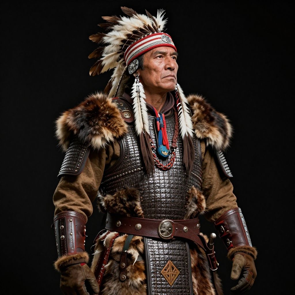 Hyper-realistic, Realism, HDR, detailed, native american indian, brown-black fur gambeson with gloves, black background