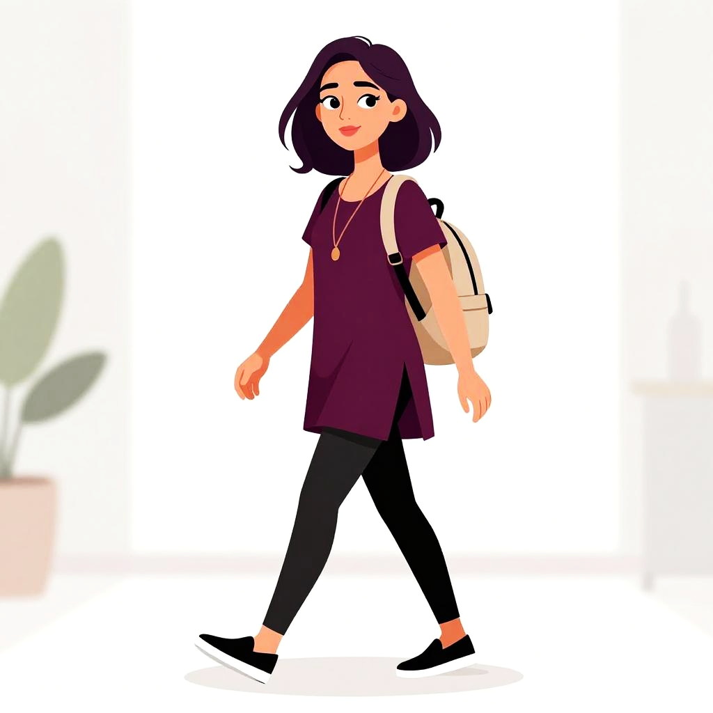 Digital illustration of a young woman with fair skin and shoulder-length dark purple hair, walking. She wears a loose, short-sleeved, dark purple top, black pants, and black flats. A light beige backpack is slung over her right shoulder. She has a necklace with a small pendant and a gentle smile. The background is white with a faint, blurred green plant on the left. The style is cartoonish with clean lines and vibrant colors, emphasizing a casual, everyday look.
