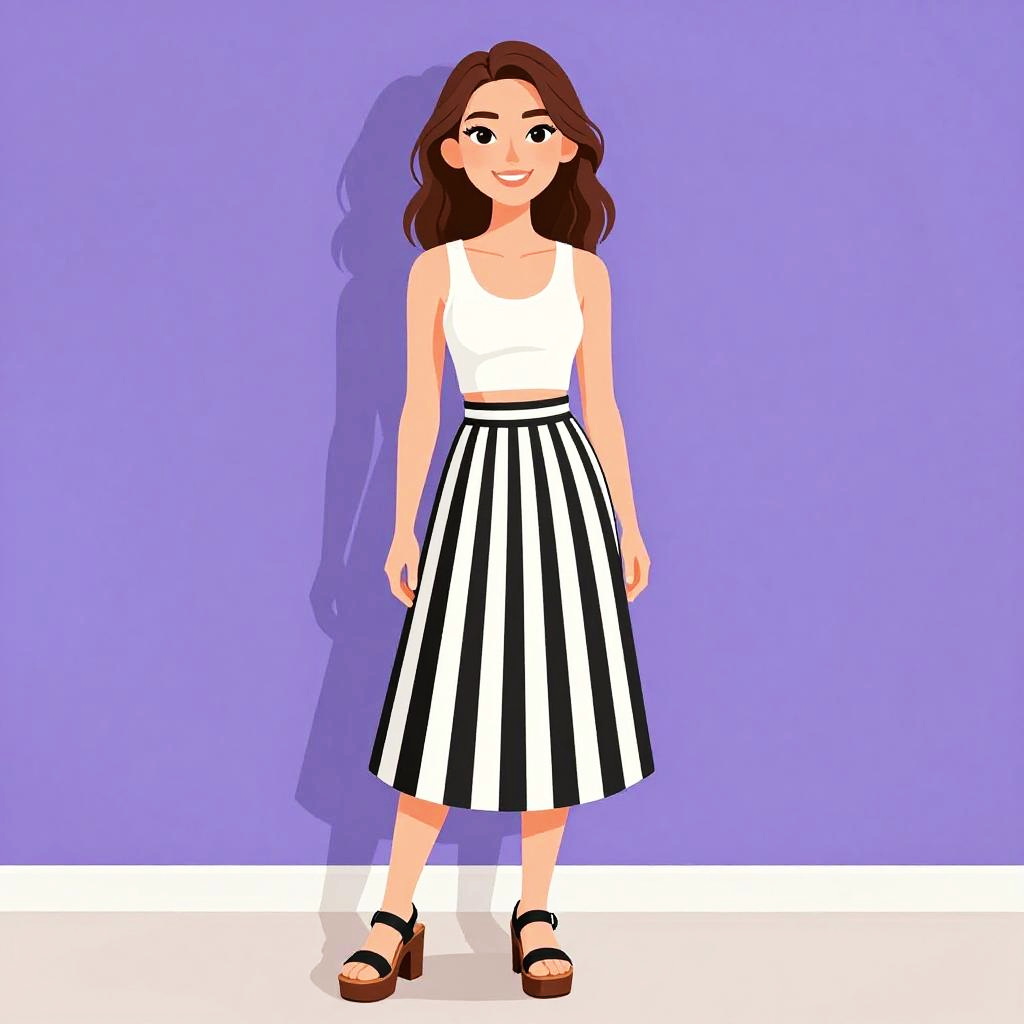 Digital illustration of a smiling woman with black bob haircut, purple tunic, black pants, black flats, white backpack, and necklace, walking. White