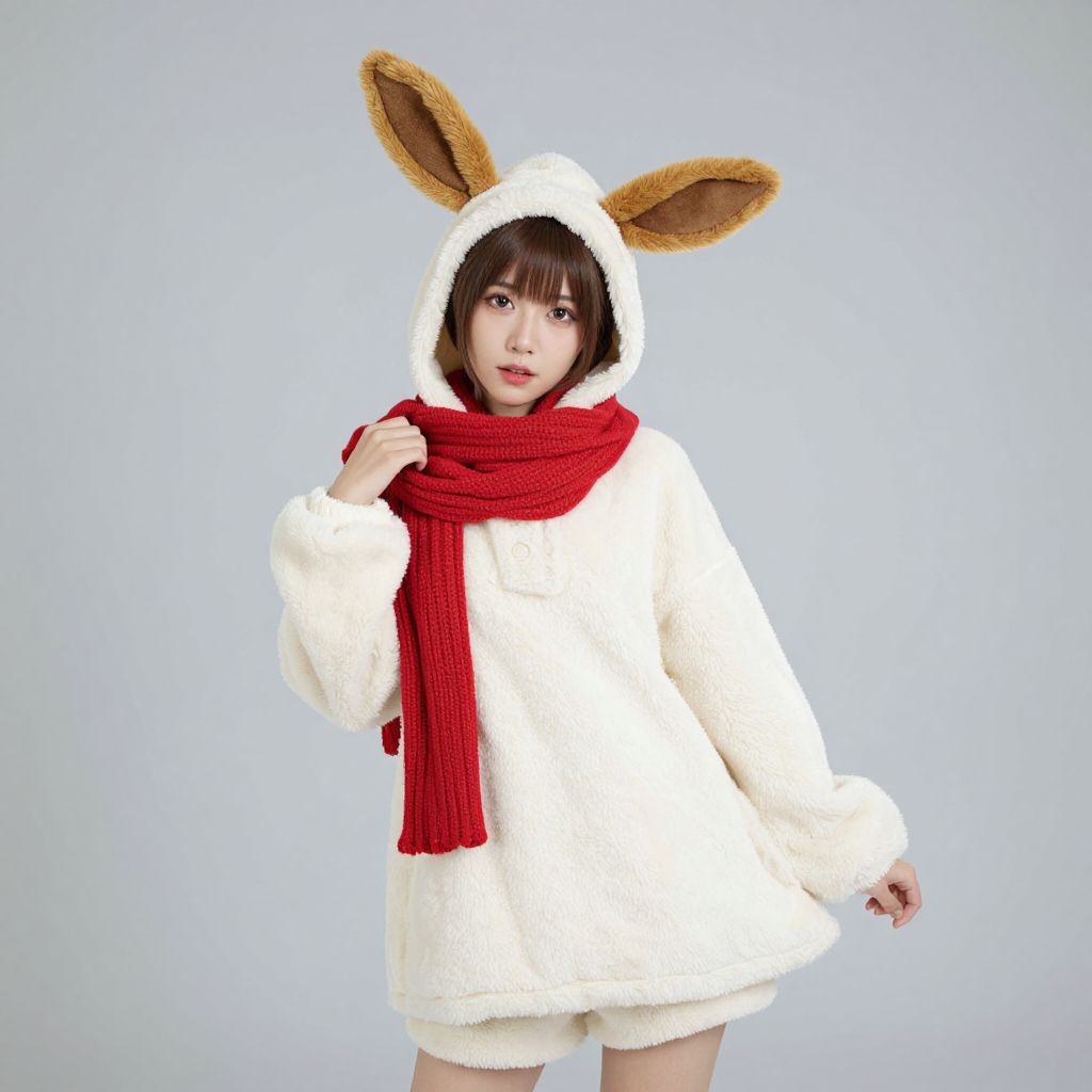 Photograph of an Asian woman with fair skin and dark brown bob-cut hair, wearing a fluffy white hoodie with large brown rabbit ears on the hood. She also has on a bright red, knitted scarf draped around her neck. She stands against a plain, light blue background. Her expression is neutral, and she is slightly pulling on the edge of her hood with her right hand. The texture of the hoodie appears soft and plush, contrasting with the knitted texture of the scarf. Her outfit gives a cute, whimsical vibe.