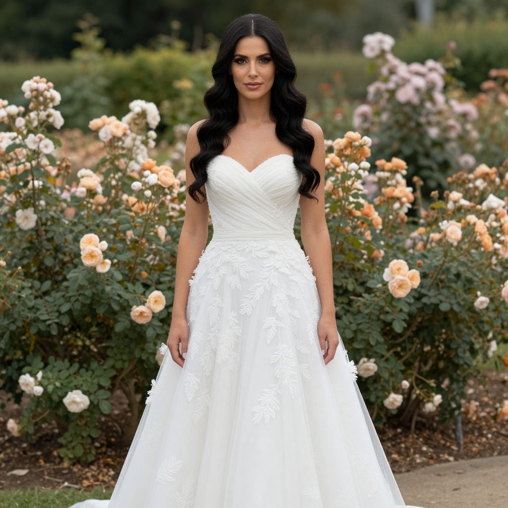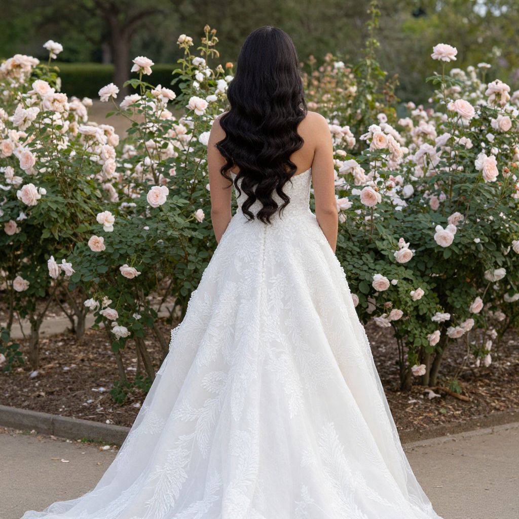 Woman in rose garden with long cascading strapless white wedding dress with long dark, wavy hair parted down middle for her wedding hairstyle
