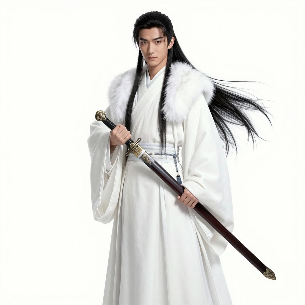 Masterpiece, (masterpiece, top quality, best quality), solo, weapon, male focus, sword, long hair, white background, fur trim, sheath, holding, black hair, simple background, holding weapon, wide sleeves, sheathed, looking at viewer, standing, holding sword, tassel, long sleeves, closed mouth, 1boy, chinese clothes, hanfu