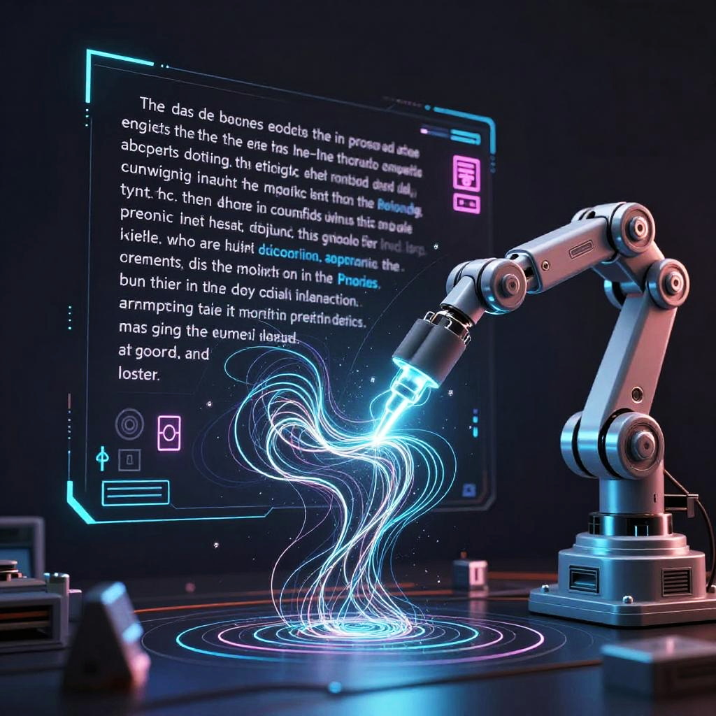 Text to drawing AI depicted as an advanced visualization engine, converting text prompts into detailed sketches, mechanical arms crafting fluid lines, surrounded by floating text fragments and glowing symbols, neon colors on dark background, cyberpunk artistic vibe.