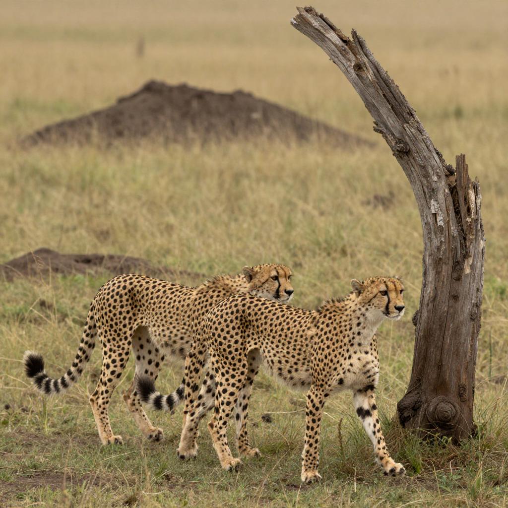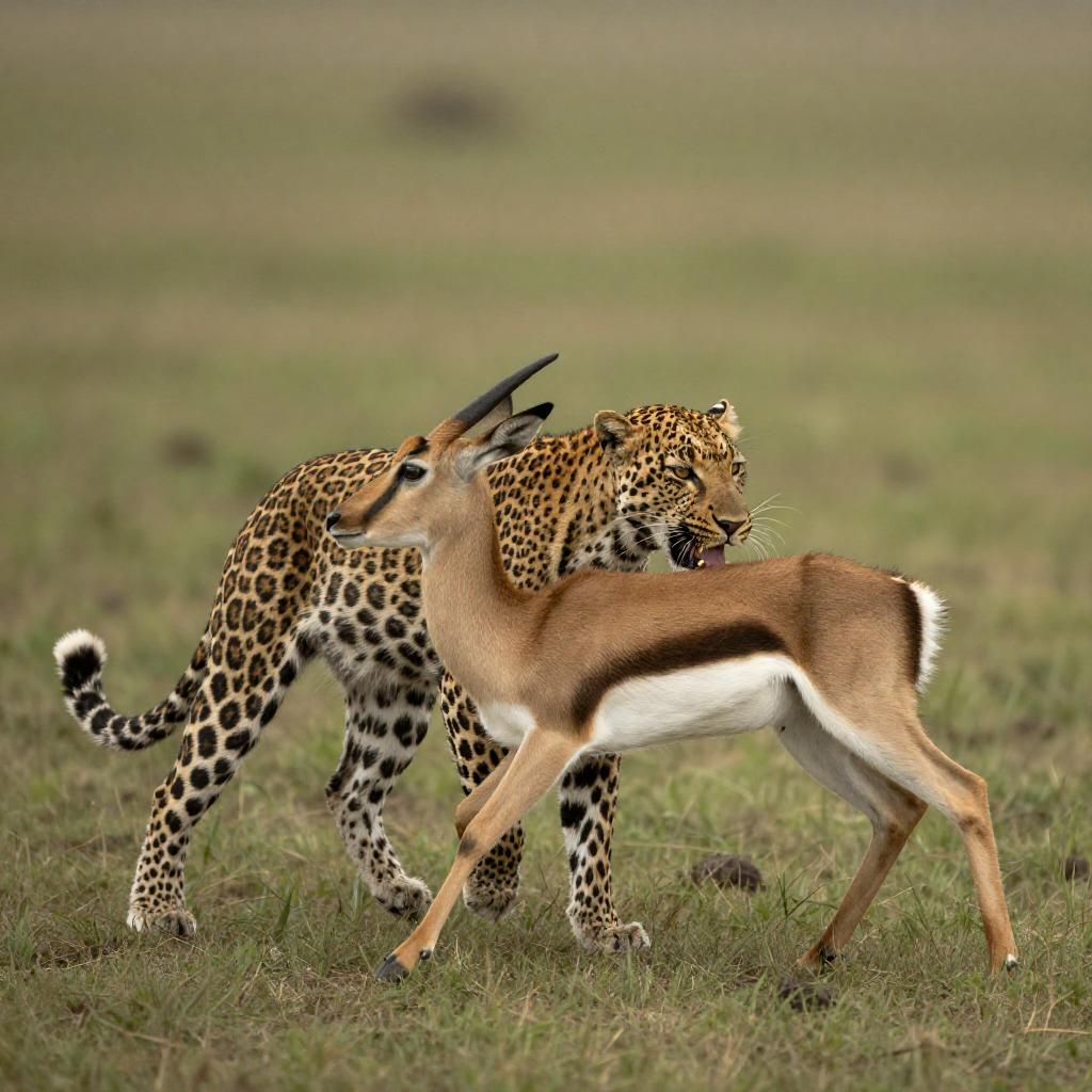 Photograph of a leopard with a spotted coat and black-tipped tail, pouncing on a brown antelope with white underbelly and black-tipped ears. The leopard's mouth is open, biting the antelope's neck. They are on a grassy plain with blurred background. The antelope's legs are splayed, indicating struggle.