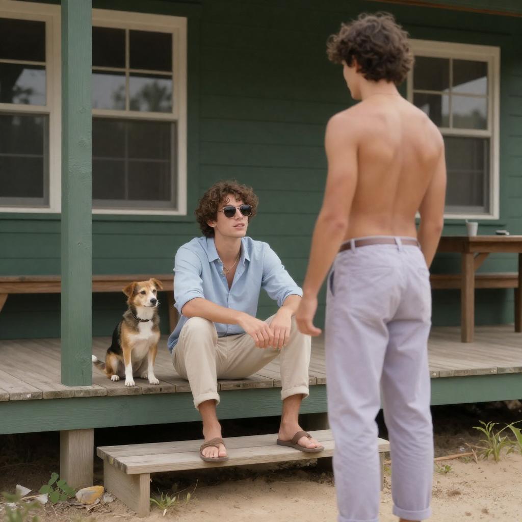 Photograph of two people sitting on the concrete steps of a white, wooden house with a porch. Both wear casual clothes; the person on the left has a blue shirt and brown hair, the person on the right wears a light blue shirt and dark hair. They sit close, facing each other. Lush greenery surrounds the house, with a grassy lawn and shrubs in the foreground. Tall trees are in the background. Bright, slightly cloudy sky above.