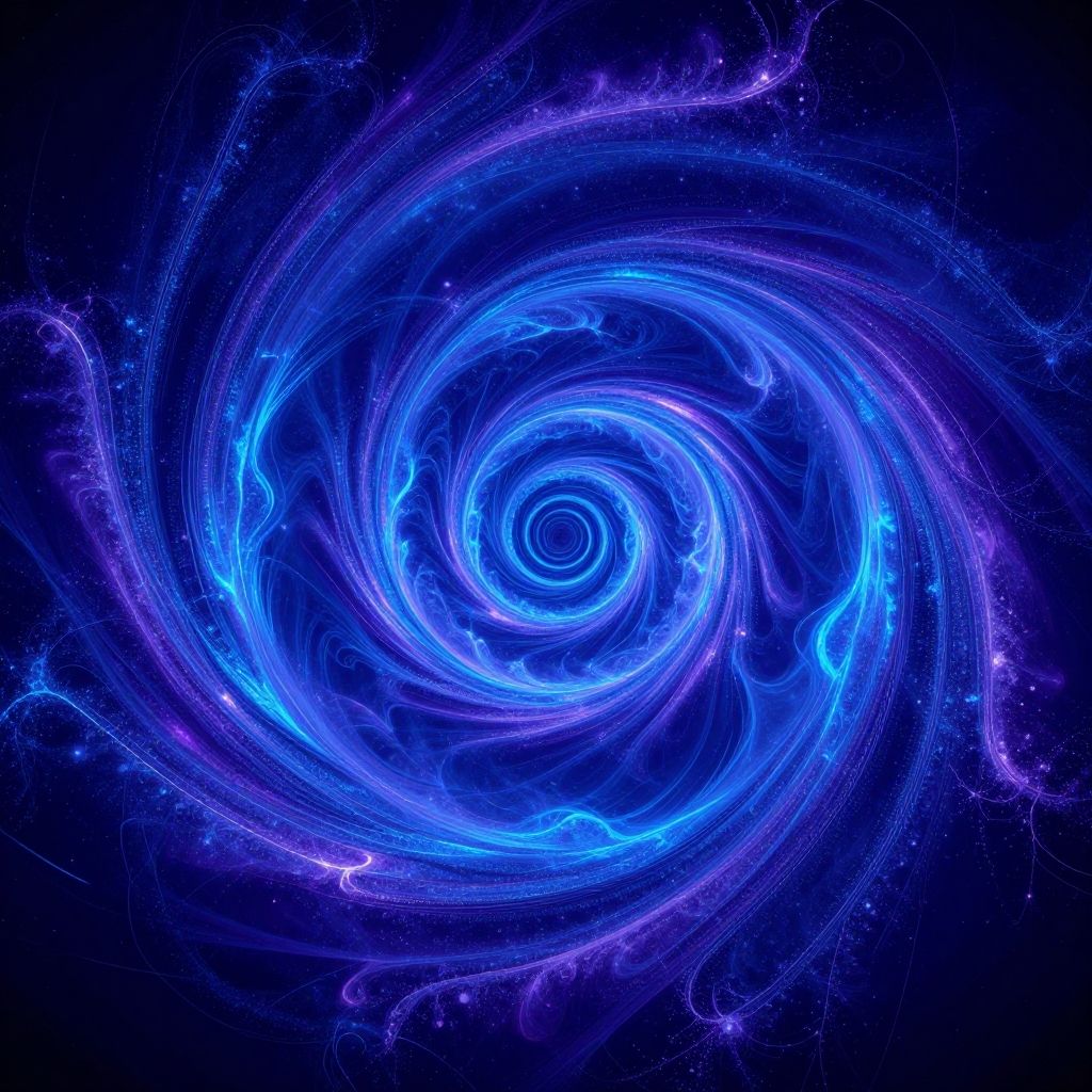 Fractalism spiral, mesmerizing endless loops and curves, glowing edges with electric blues and purples, hyper-realistic style, 3D depth, cosmic energy vibe