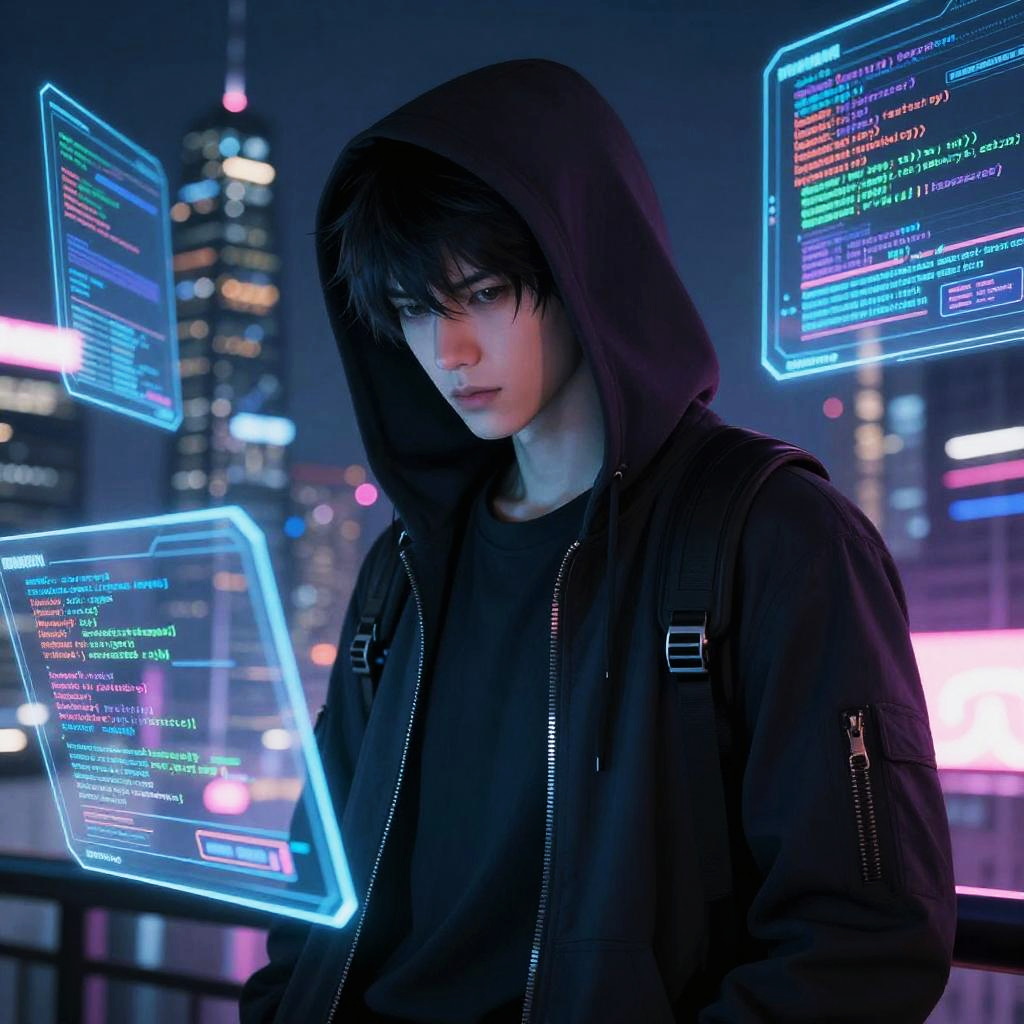 Realistic photo.a mysterious hacker, wearing a dark hoodie, holding a cybernetic device, in a neon-lit underground, rendered in the tense and sci-fi-heavy style of Hiroya Oku. realistic photo