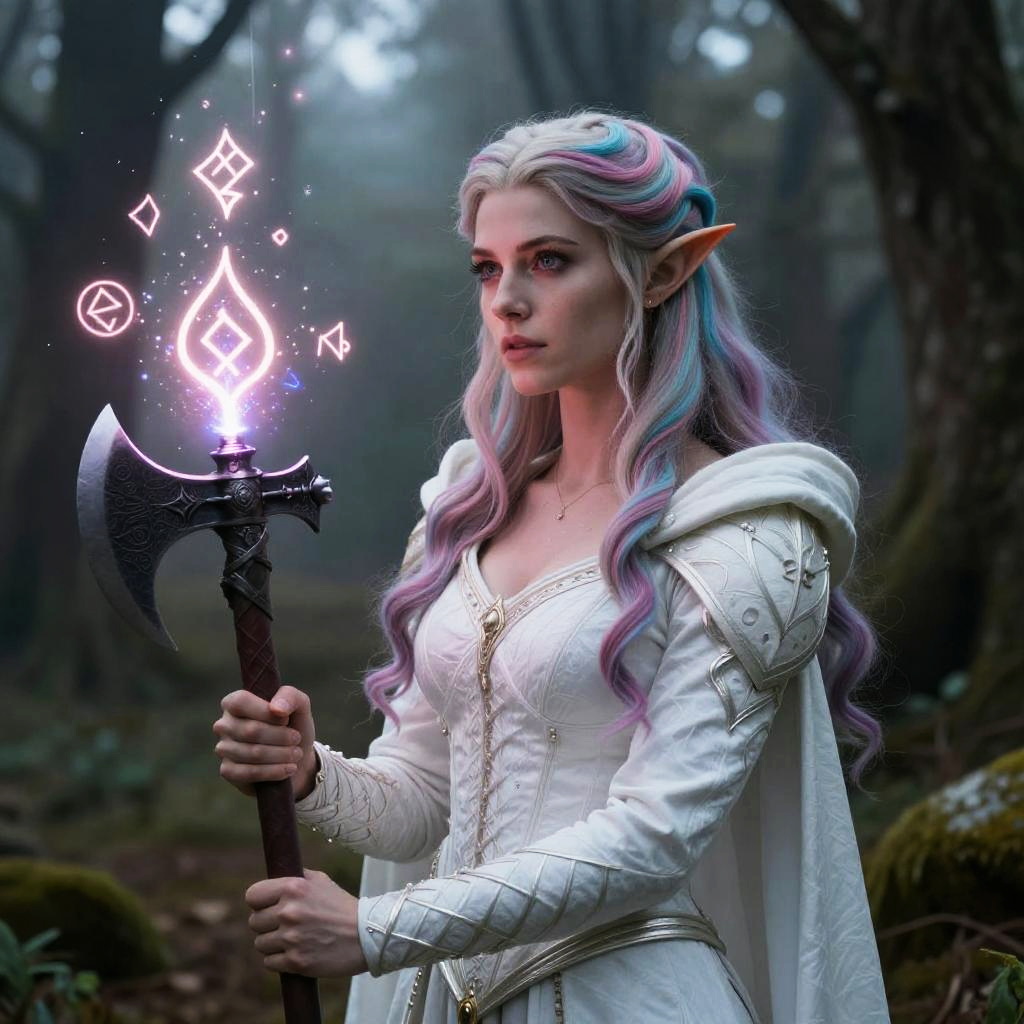 A hyperrealistic portrait of an elvish woman mage standing in a misty forest. She has long multicolored hair in pastel shades of pink, blue, and lavender, grey eyes, and pointed elf ears. She wears an elegant white fantasy dress with detailed embroidery, armor-like shoulder pads, and a flowing cape. She holds a large ornate axe emitting glowing magical runes and light, indicating spellcasting. The background features a blurred, wooded landscape, creating a mysterious atmosphere.