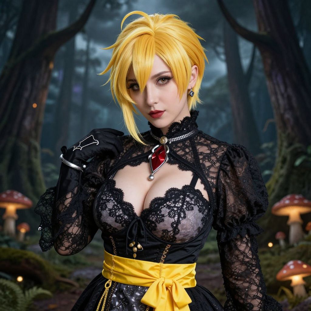 A confident woman with a short, spiky yellow hairstyle poses in a dark fantasy forest, wearing a gothic-inspired costume with black lace overlay and a yellow sash around her waist, her face is sharp with high cheekbones and red lips, the setting is under a stormy sky with tall trees and glowing mushrooms in the background. The woman has big tits and cute face