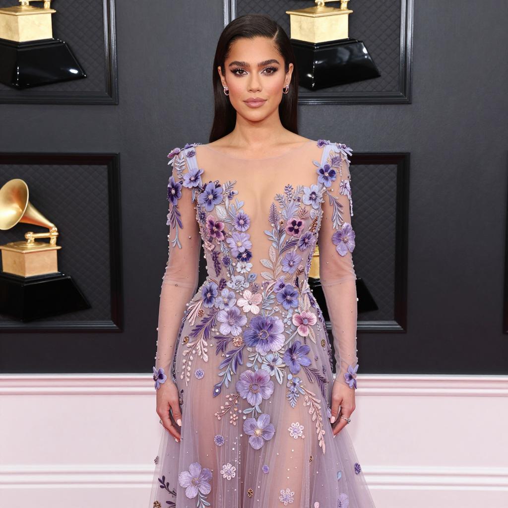 A glamorous pop star posing confidently on the Grammy Awards red carpet, wearing an eye-catching lavender gown adorned with intricate floral embroidery and sheer embellished sleeves, styled with sleek hair and elegant makeup.