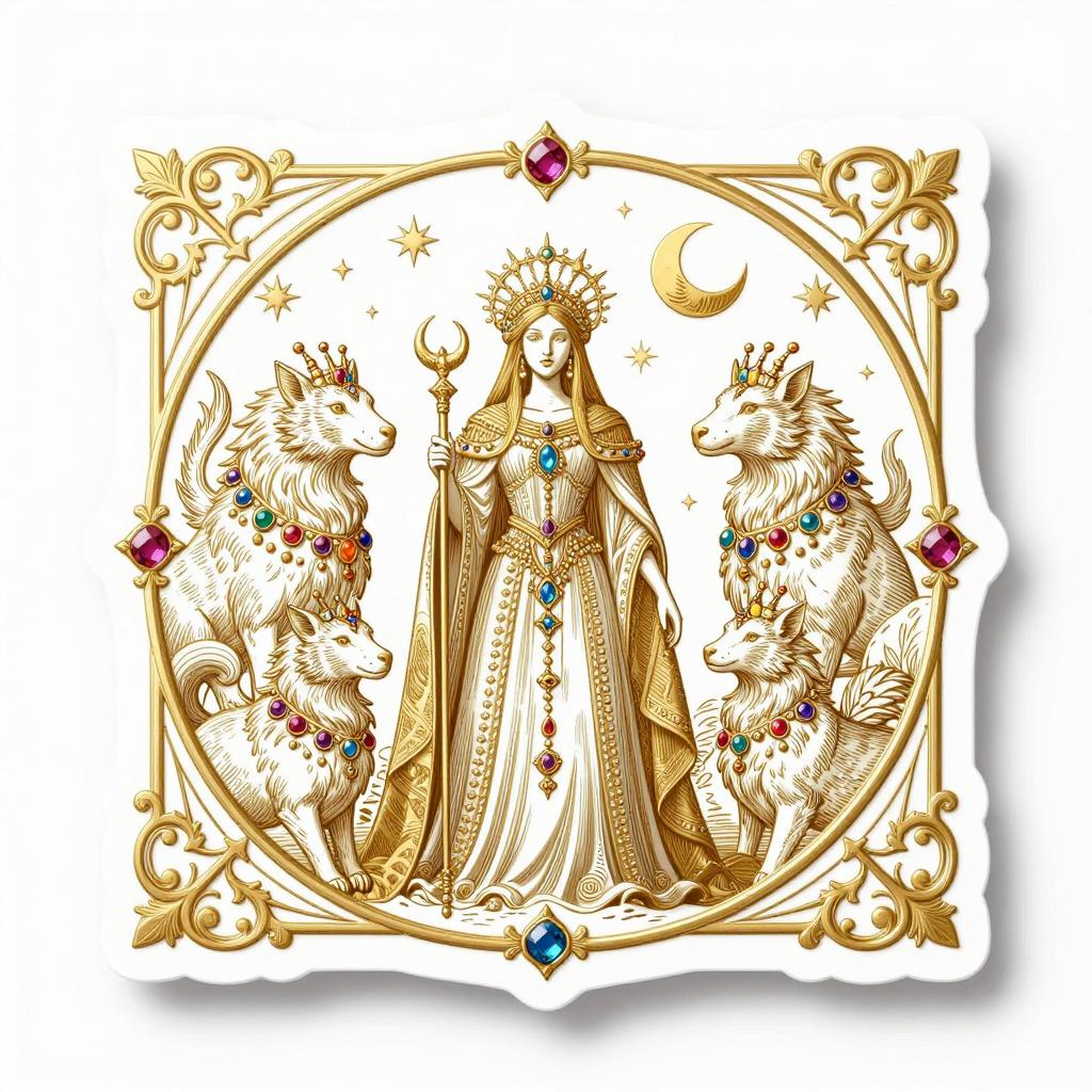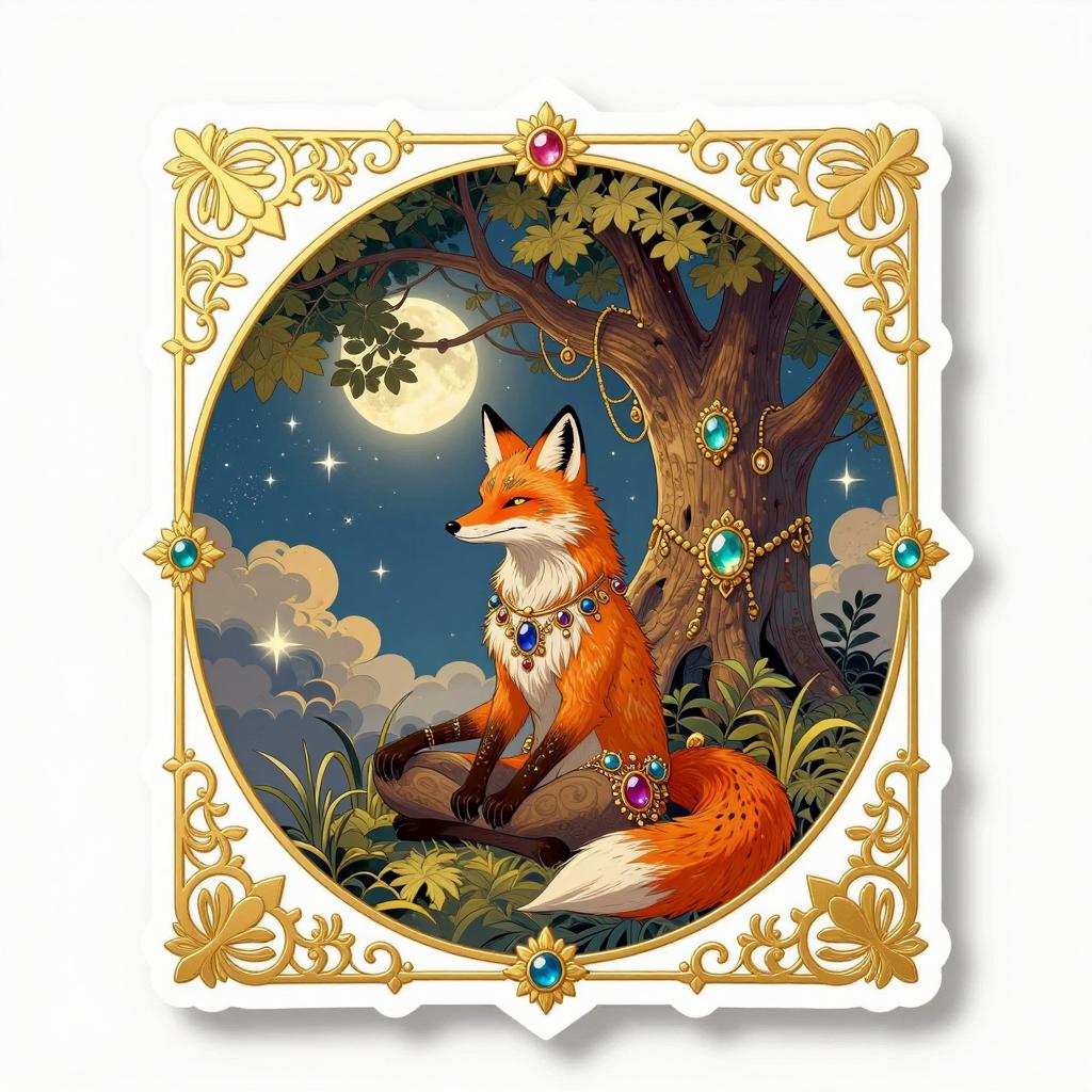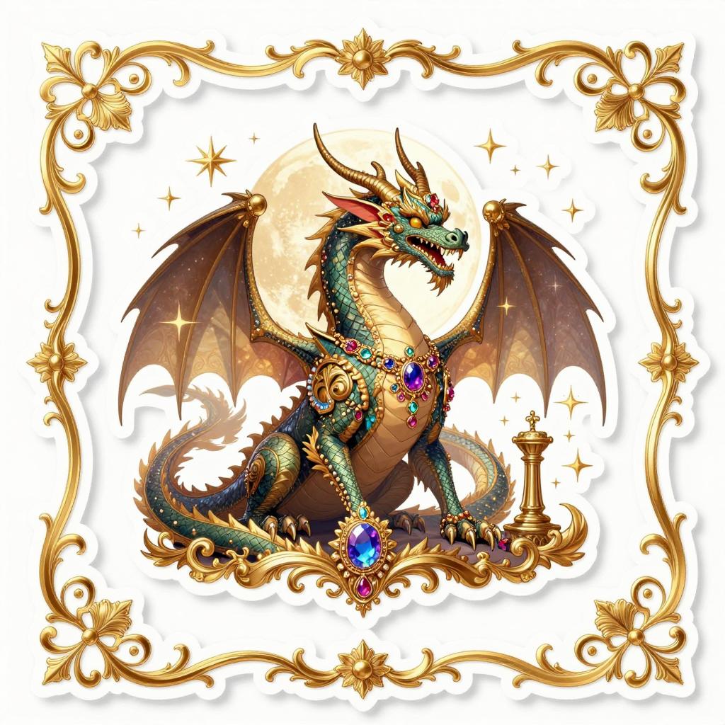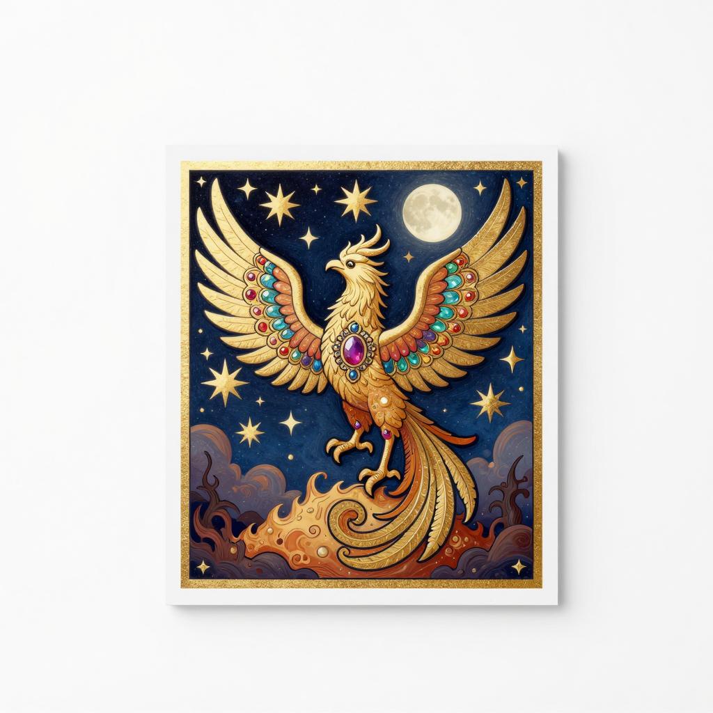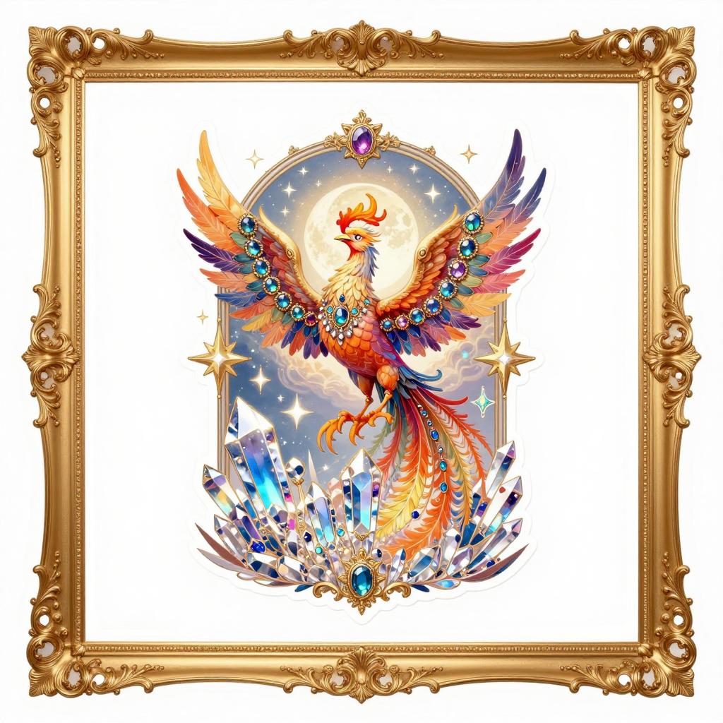 Editing 2d, solid white background, thin gold foil border, sticker, medieval illuminated manuscript style, detailed ornate fantasy scene of phoenix rising from ashes wearing colorful gemstone jewelry, stars and moon in bright sky