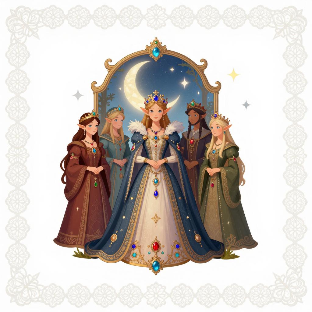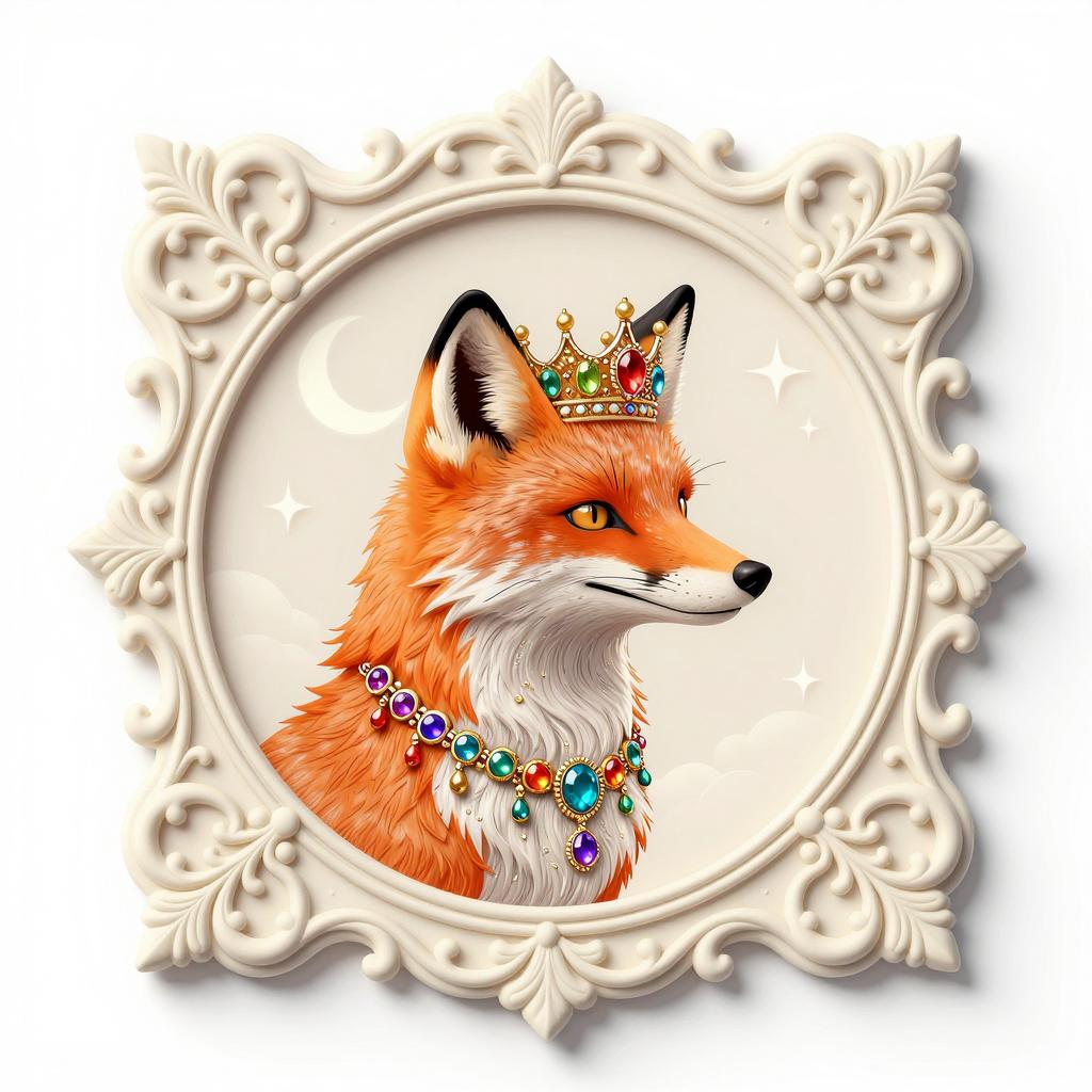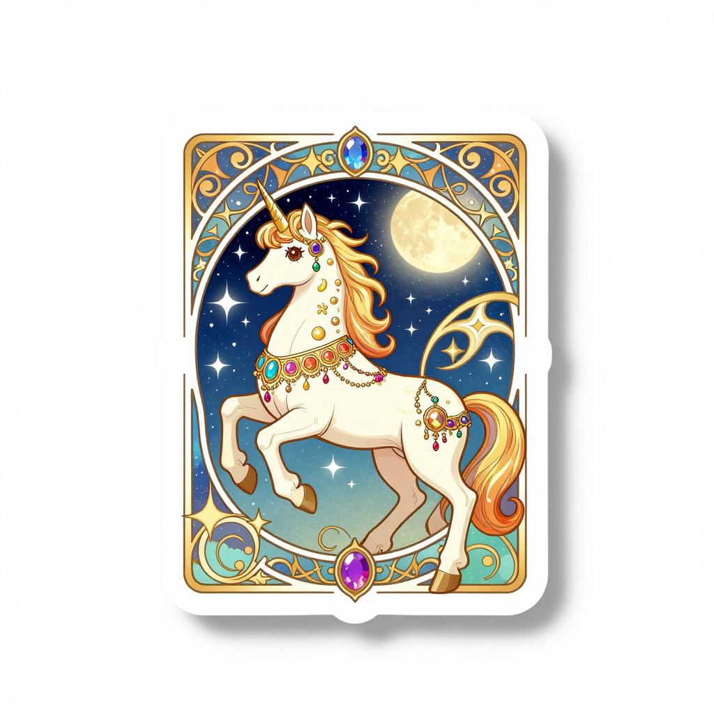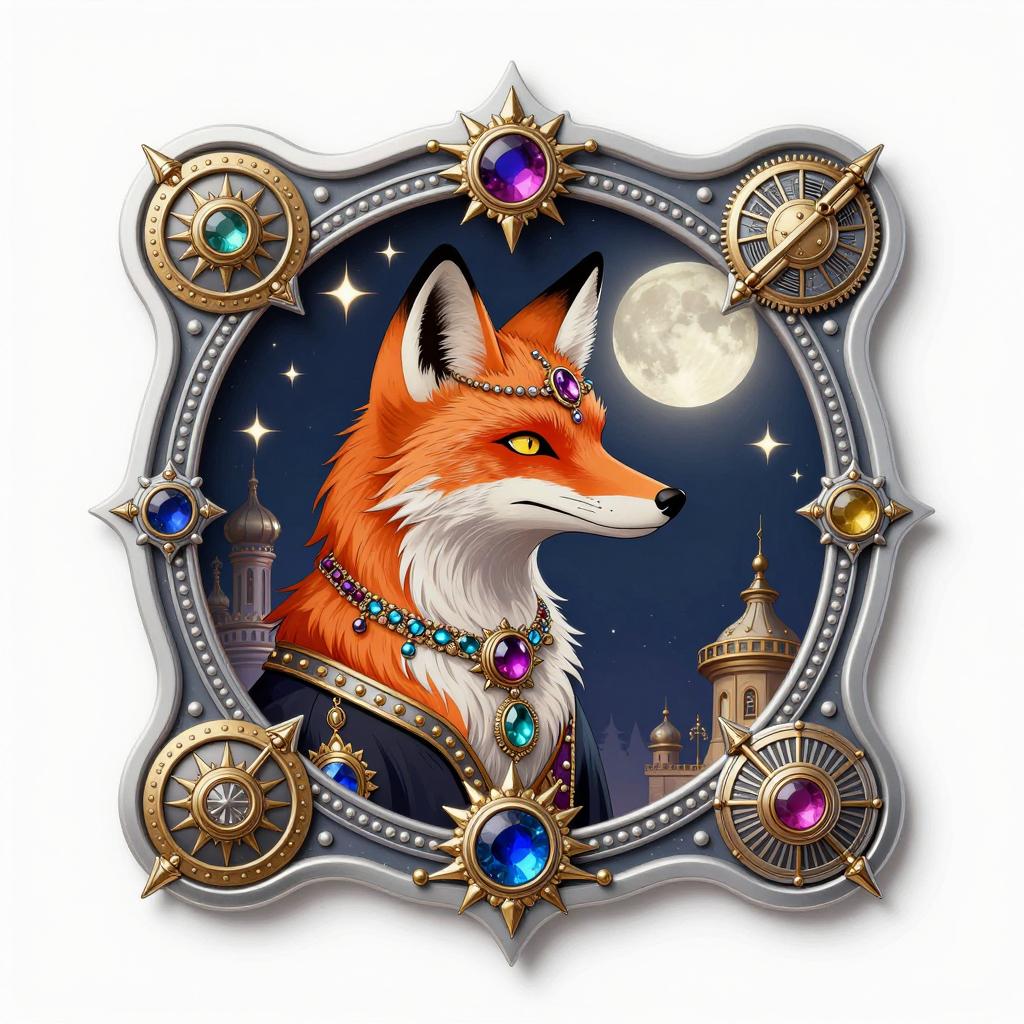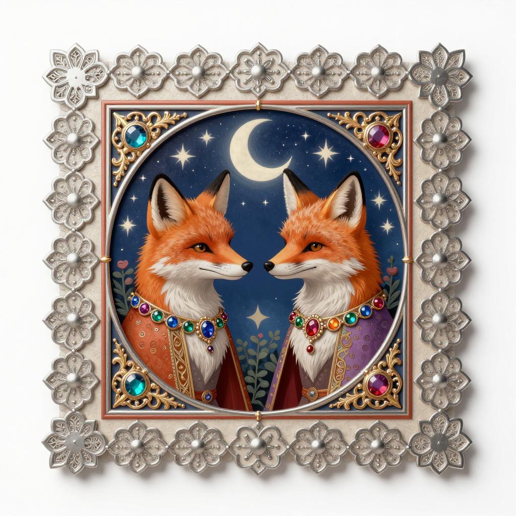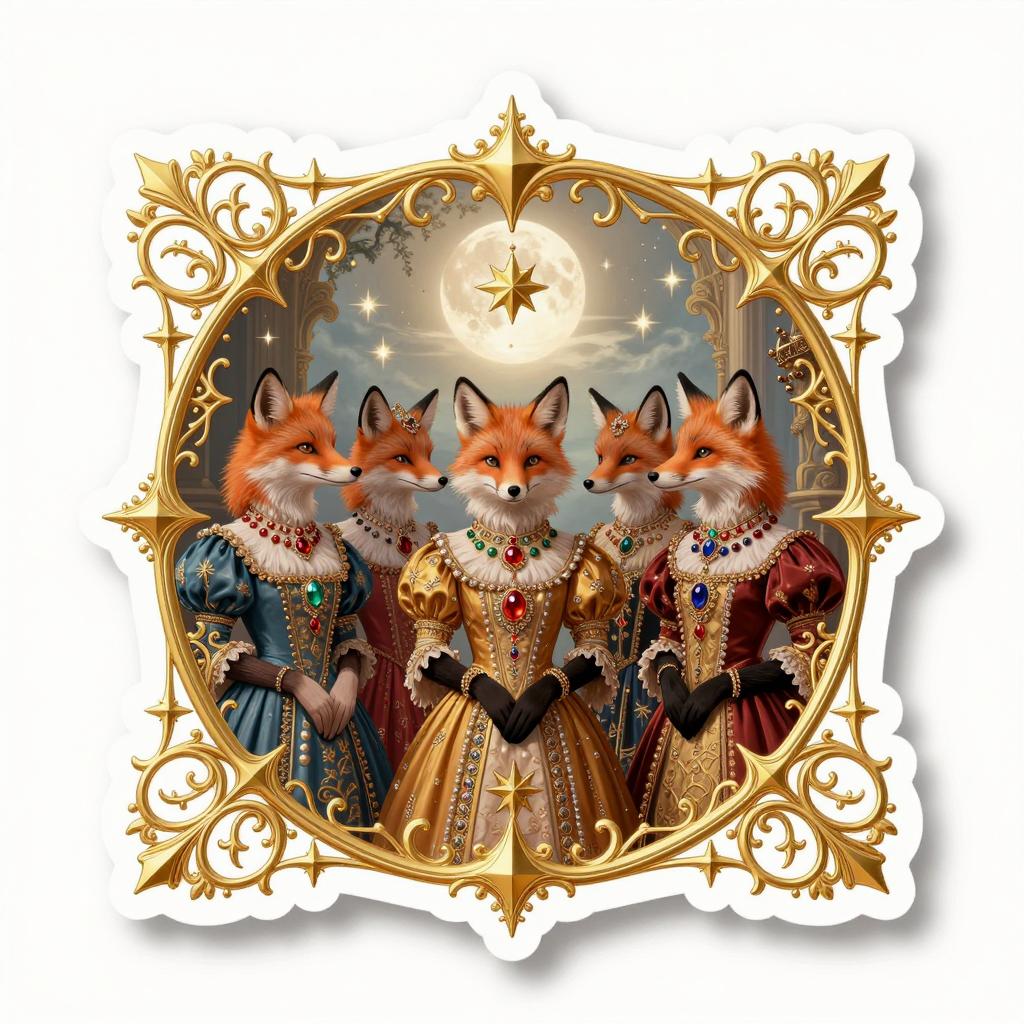 Editing 2d, solid white background, thin gold foil border, sticker, medieval illuminated manuscript style, detailed ornate fantasy scene of phoenix rising from ashes wearing colorful gemstone jewelry, stars and moon in bright sky