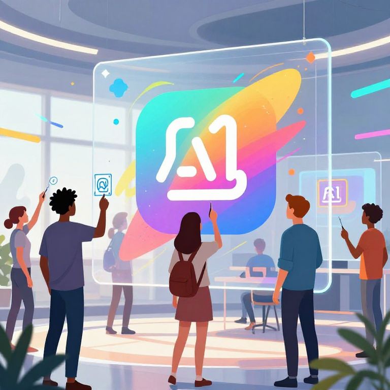 Use Dall-E for free concept illustration, a diverse group of people collaboratively generating AI art on large transparent screens, bright and colorful setting, dynamic light effects, symbolizing open access to advanced AI tools, modern and futuristic ambiance