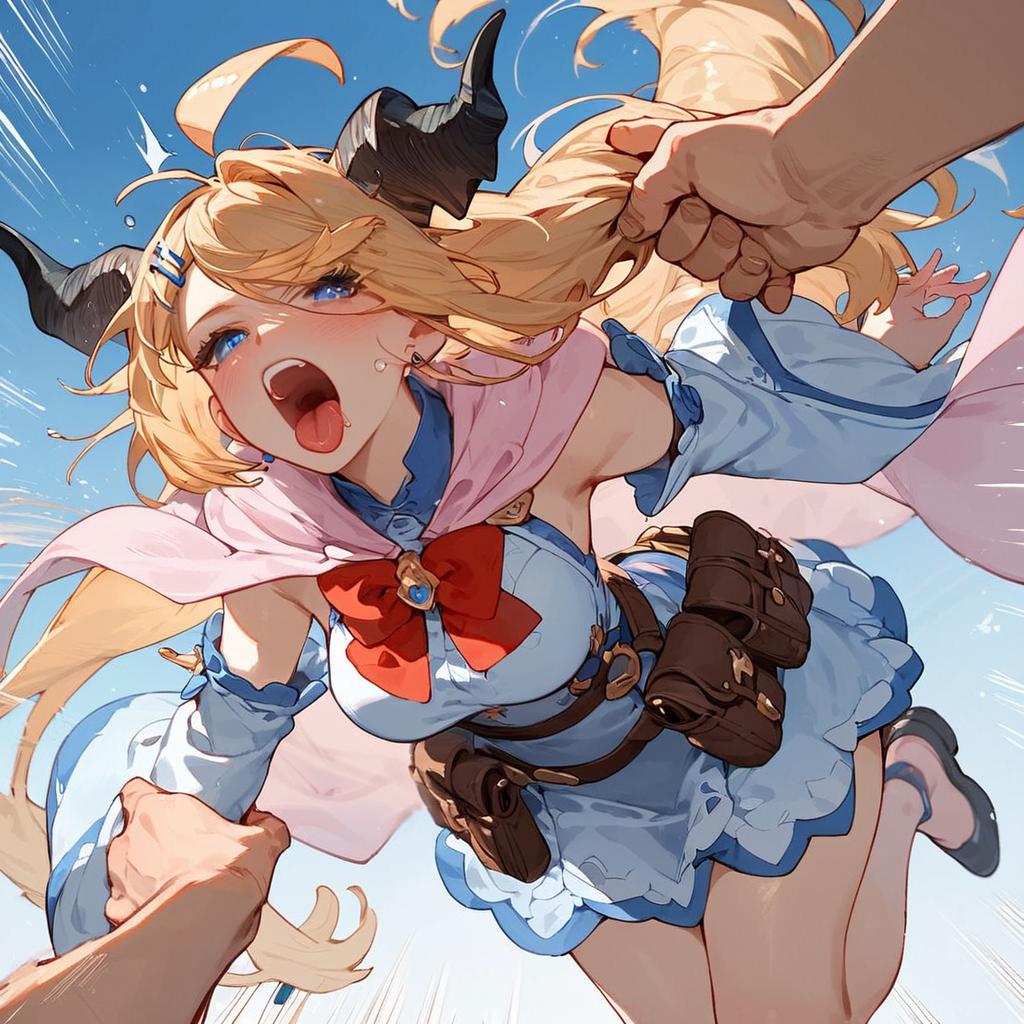 Score_9, score_8_up, score_7_up, source_furry, source_anime, blue sky, speed lines, motion blur, lifting, in air, flying, horn grab, WatameBase, very long hair, ahoge, hairclip, fur-trimmed dress, short dress, red bowtie, detached sleeves, pouch, fur-trimmed cape, pink cape, swinging, aquascreaming, screaming, open mouth, crying with eyes open, windy, mature, leaning forward, horn grab, pov