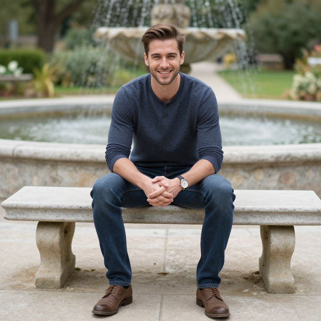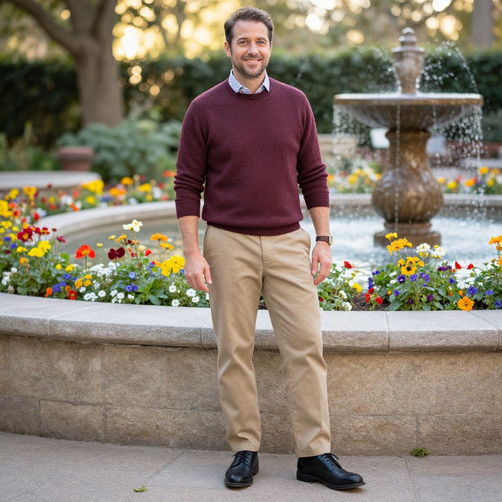 A man, burgundy lightweight knit sweater, khaki chinos, black leather brogues, outdoor garden, vibrant flowers, soothing water fountain, pinhole camera style, relaxed smile, warm sunlight filtering through leaves. Man has masculine face and piercing eyes