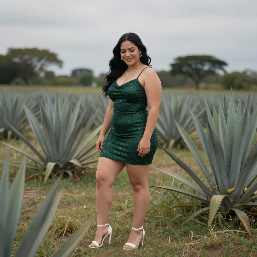 Photograph of a curvy woman with long black hair, wearing a sparkly green mini dress and white high-heeled sandals, standing in a grassy field with blue agave plants. She smiles, looking down, with trees and a cloudy sky in the background.