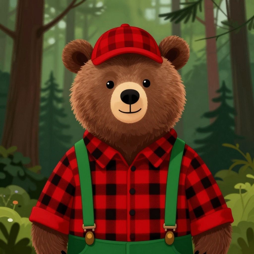 Digital illustration of a friendly brown bear wearing a red plaid shirt, green overalls, and a matching red plaid hat in a forest.