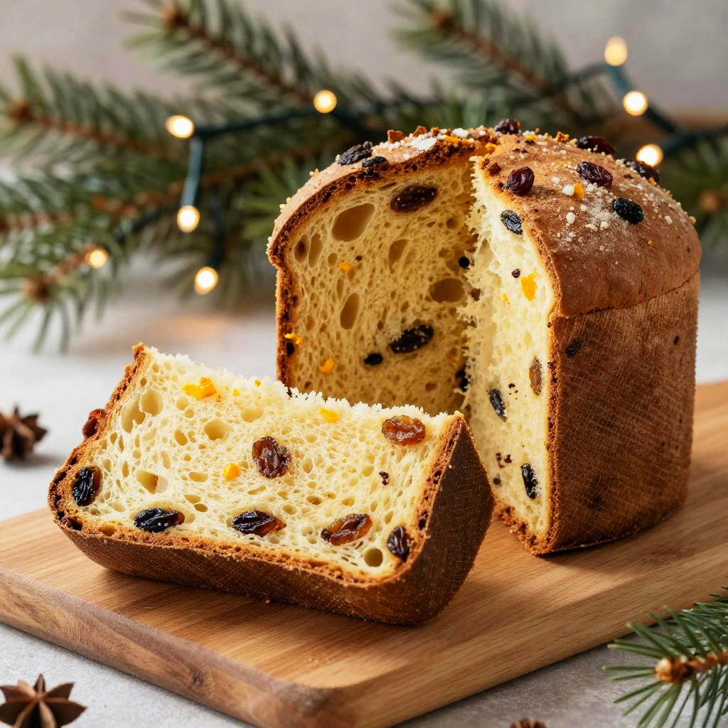 Close-up of a sliced panettone on a wooden board, showcasing its airy crumb and studded with raisins and citrus peels, with a backdrop of festive holiday lights and pine branches, evoking a traditional Christmas celebration.