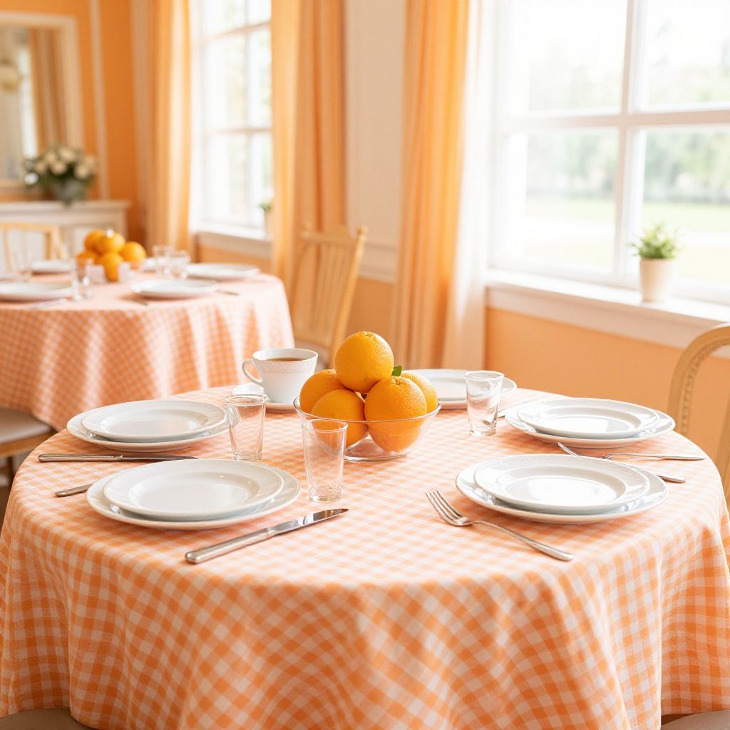 Photograph of a bright, sunlit dining room featuring three round tables covered with orange and white checkered tablecloths. Each table has a central arrangement of fresh oranges, white plates, clear glasses, and silverware. The background includes orange curtains and a window with sunlight streaming in. A vase with flowers and a mirror are visible in the blurred background, adding a warm, inviting atmosphere to the room. The overall color scheme is vibrant orange and white, creating a cheerful, summery feel.