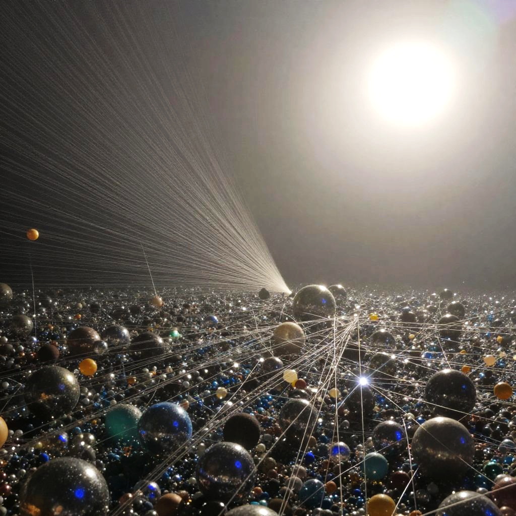 A visual representation of a quantum realm, shimmering particles, interconnected strings, 8k panoramic view, foggy and sunny, shifting light states, inspired by Edward Hopper, Paul Klee, Tamara de Lempicka