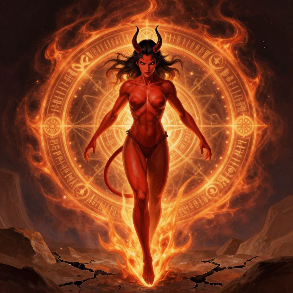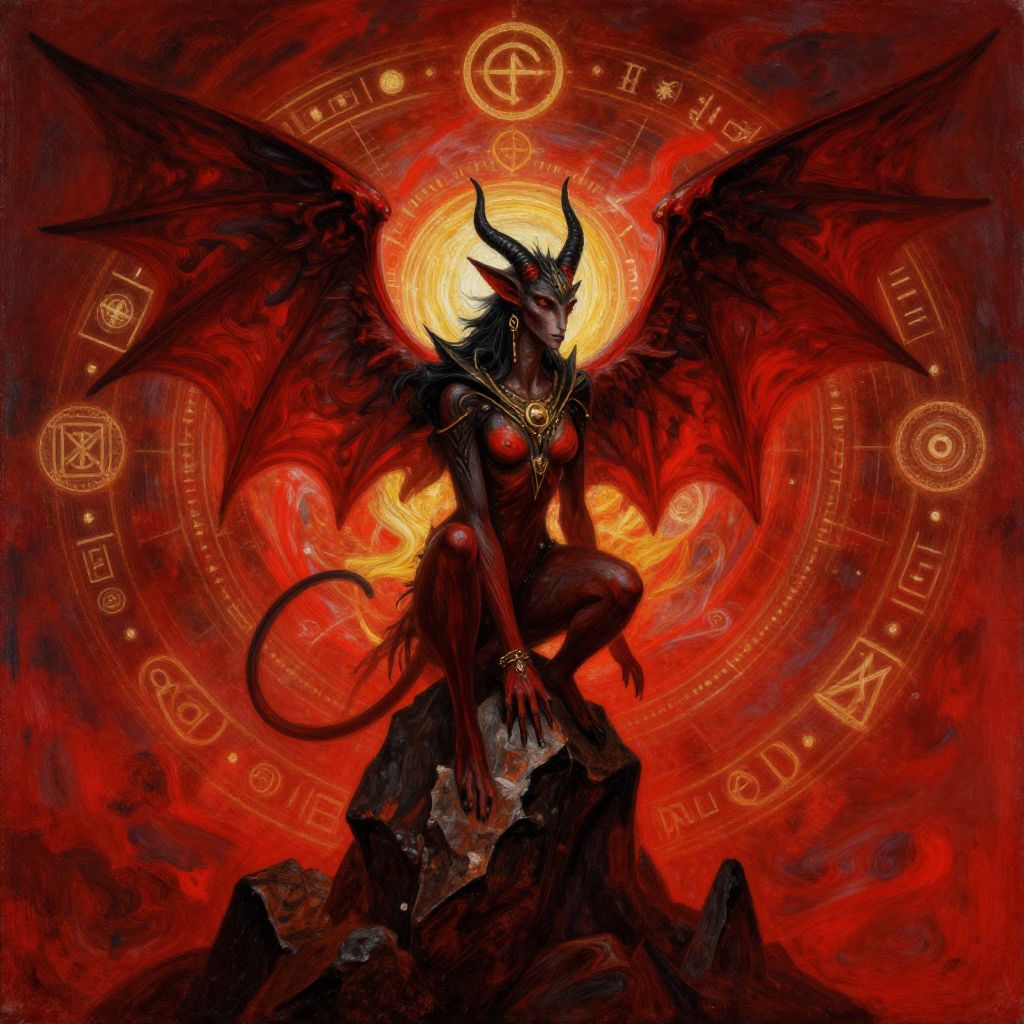 Azazel painting featuring an enigmatic winged creature with human and beast features, perched on a jagged rock, surrounded by swirling mystical symbols and glowing runes, created in a vibrant, modern fantasy style with a palette of reds, blacks, and golds.