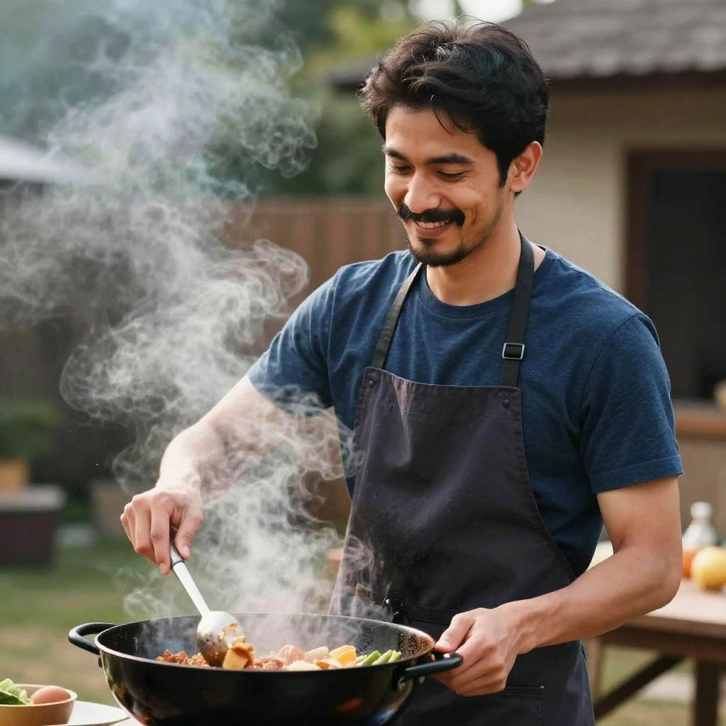A powerful portrait of a gritty transmasculine street chef in film-noir inspired street photography with high contrast, with tattoos visible under rolled sleeves, customized pinstriped apron, utilitarian jewelry and smoky urban lighting reflecting their unique gender identity,