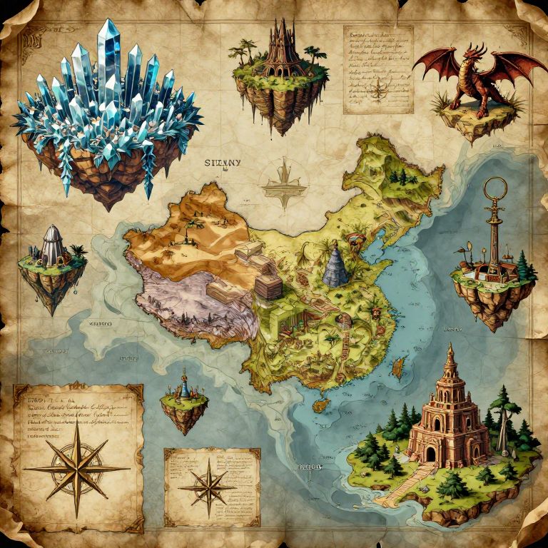 Fantasy map illustration with floating islands, crystal formations, dragon, medieval castles, compass, and detailed terrain, in vibrant, textured style.