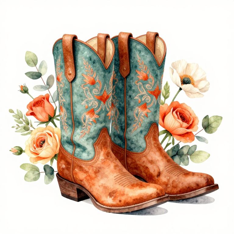 The image is a highly detailed, watercolor illustration of a pair of teal and orange cowboy boots adorned with intricate floral embroidery. The boots are positioned side by side, with the left boot slightly overlapping the right. Surrounding the boots is a lush bouquet of flowers, including vibrant orange roses, delicate white poppies, and green eucalyptus leaves, creating a harmonious blend of colors and textures. The flowers are arranged in a natural, organic manner, with some stems and leaves extending beyond the boots, adding depth and dimension to the composition. The boots themselves are crafted with a rustic charm, featuring brown leather straps and a sturdy, weathered look that suggests they have been worn and loved. The overall scene is set against a plain background, which allows the vibrant colors and intricate details of the boots and flowers to stand out prominently. The illustration exudes a bohemian aesthetic, with its use of soft, watercolor textures and a palette that evokes a sense of warmth and nostalgia.