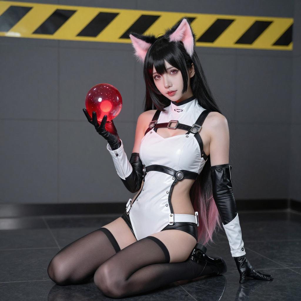 Photograph of an Asian woman in a detailed cosplay outfit, featuring black hair with pink cat ears, a white jacket with black straps, black gloves, and a black and red outfit. She is posing with one hand raised, looking to the side with a slightly open mouth. Background includes a black brick wall and a yellow sign.