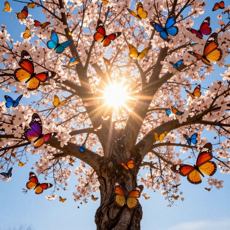Majestic Tree with Radiant Sun and Butterflies