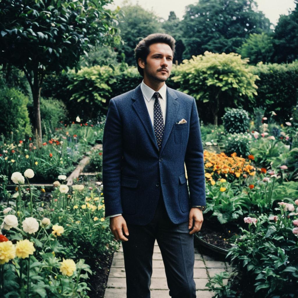 Photograph of a muscular, bearded man with short dark hair, wearing a blue sports shirt and black shorts, standing in a vibrant, colorful garden