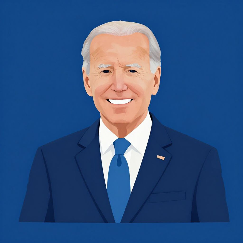 Biden clipart in vector style, depicting a cheerful elderly man with a presidential demeanor, wearing a navy suit and tie, simple shapes and smooth gradients, emphasis on approachable and friendly expression, ideal for infographics and social media content.