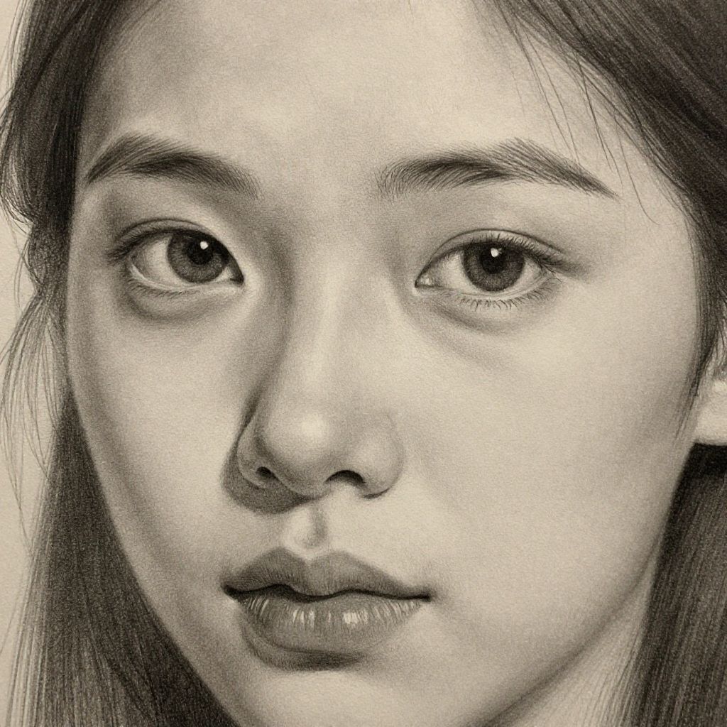 Realistic sketches of a human face with expressive eyes and subtle emotions, focus on fine skin texture, delicate hair strands, and deep shadows under soft lighting, graphite pencil technique emphasizing realism and depth.