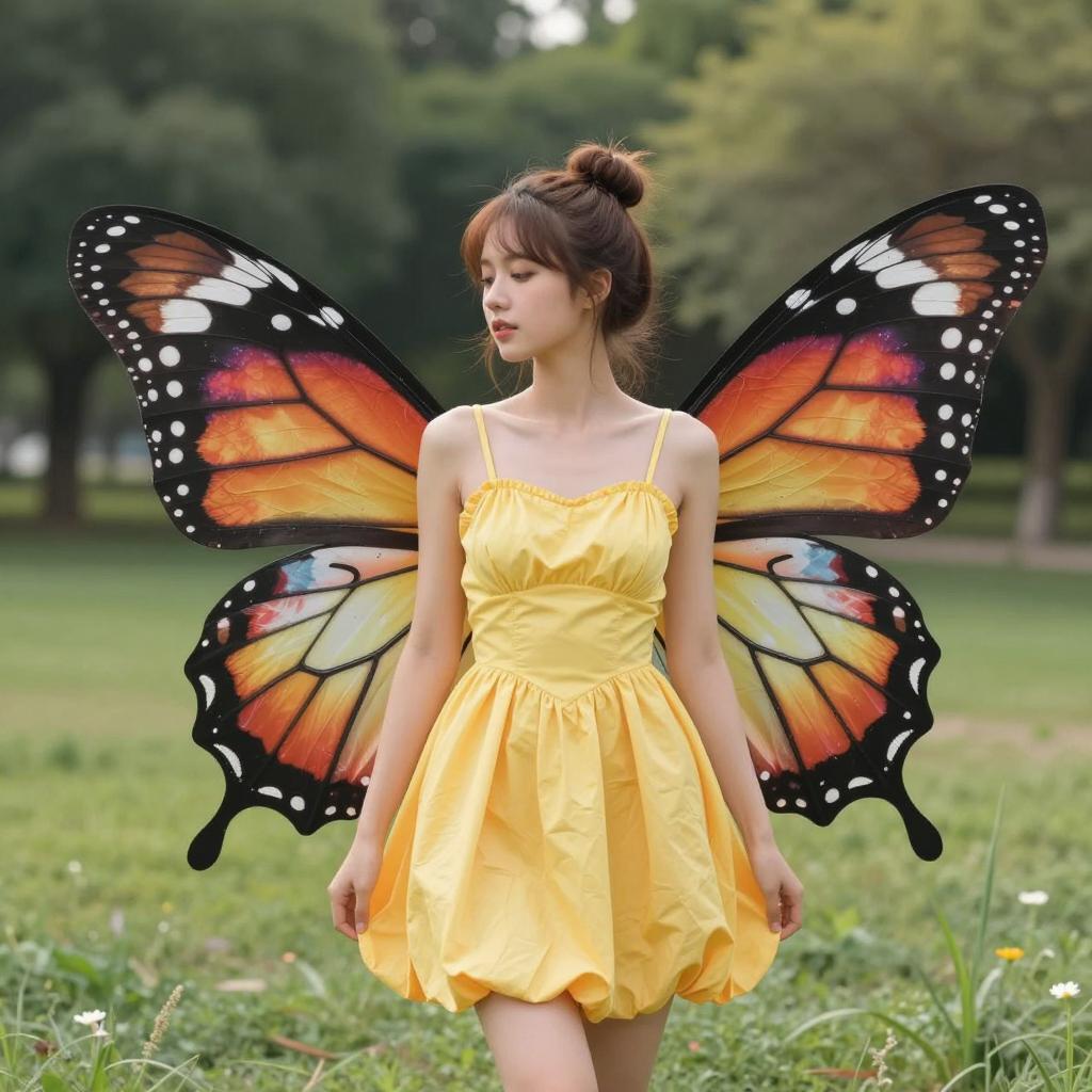 Orange fairy wings costume, photograph of young woman standing on street, wearing orange fairy dress, large orange and red butterfly wings, long blonde hair, natural light, sunny day, slightly blurred background, street lined with buildings, daytime, colorful, whimsical, fantasy theme, full body shot, soft ure, simple background, fairy costume, bright colors
