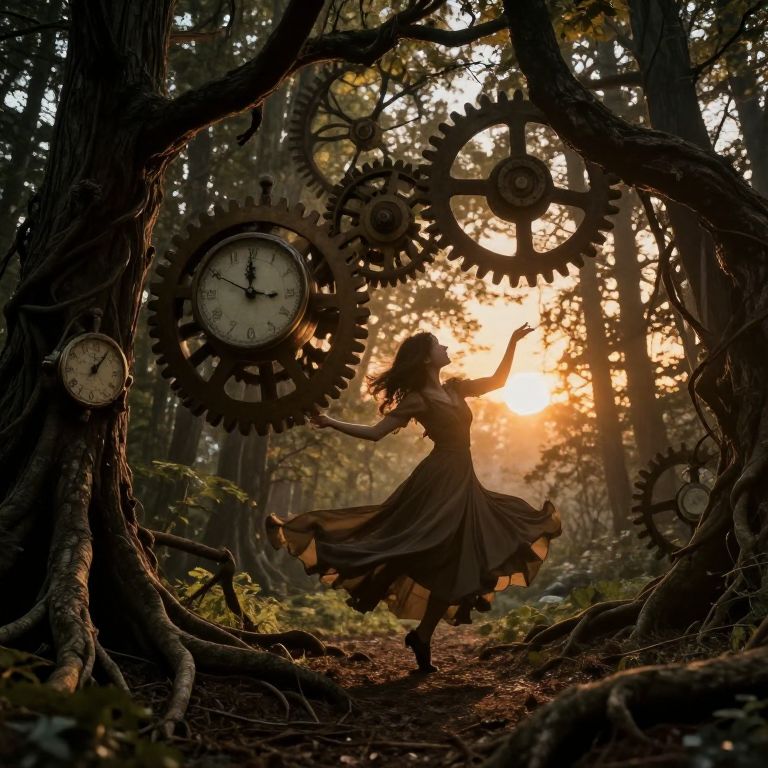 Silhouette of a woman in a flowing dress dancing gracefully in a mystical forest at sunset. Surrounding her are large mechanical clock gears and antique clock faces entwined with gnarled tree roots, creating a surreal and haunting atmosphere that suggests the passage of time and memory.