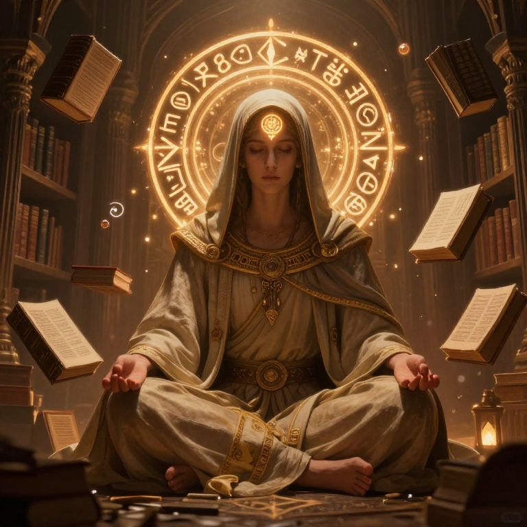 Savras, enigmatic oracle portrayed as a robed figure with a glowing sigil on the forehead, meditating in an ancient library filled with floating spellbooks, mystical runes glowing softly around, warm ambient lighting, highly detailed fantasy digital painting.